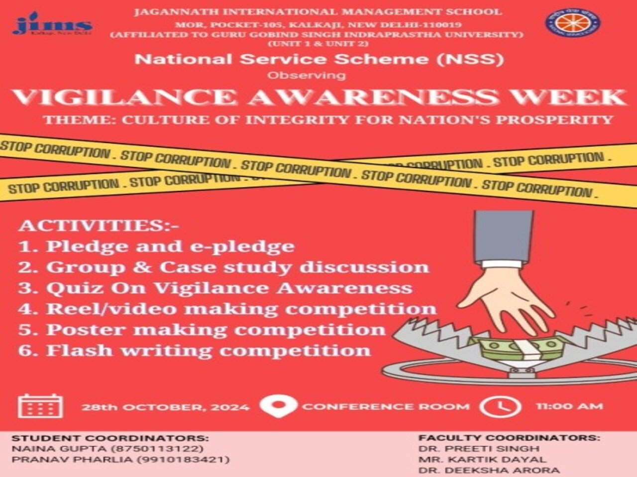 Vigilance Awareness Week was held on 28-10-2024.Prayaas, the NSS club of JIMS Kalkaji, had organized Vigilance Awareness Week on the theme “Culture of Integrity for Nation’s Prosperity” at JIMS Kalkaji. The Vigilance Awareness Week began with a pledge ceremony in the college lawn, where students committed to uphold a corruption-free and ethical society, with participants also taking the e-pledge. This was followed by a series of impactful activities. A group discussion encouraged participants to explore and debate topics related to vigilance, the role of citizens in combating corruption, and the societal impact of unethical practices. In the reel-making competition, students expressed their perspectives on anti-corruption through short videos, utilizing digital platforms to raise awareness. The poster-making competition featured both handmade and digital submissions, with participants creating visually powerful artwork on anti-corruption themes. A flash writing competition provided a platform for students to write articles, fictional stories, and poems centered on ethics and anti-corruption. Additionally, a quiz focused on anti-corruption laws, governance, and ethics engaged participants in a constructive learning experience. To extend awareness, messages were circulated via email and social media, and a brochure outlining the week’s objectives, schedule, and events was shared to guide and inform students about the importance of vigilance. These activities collectively aimed to inspire integrity and vigilance within the student community.