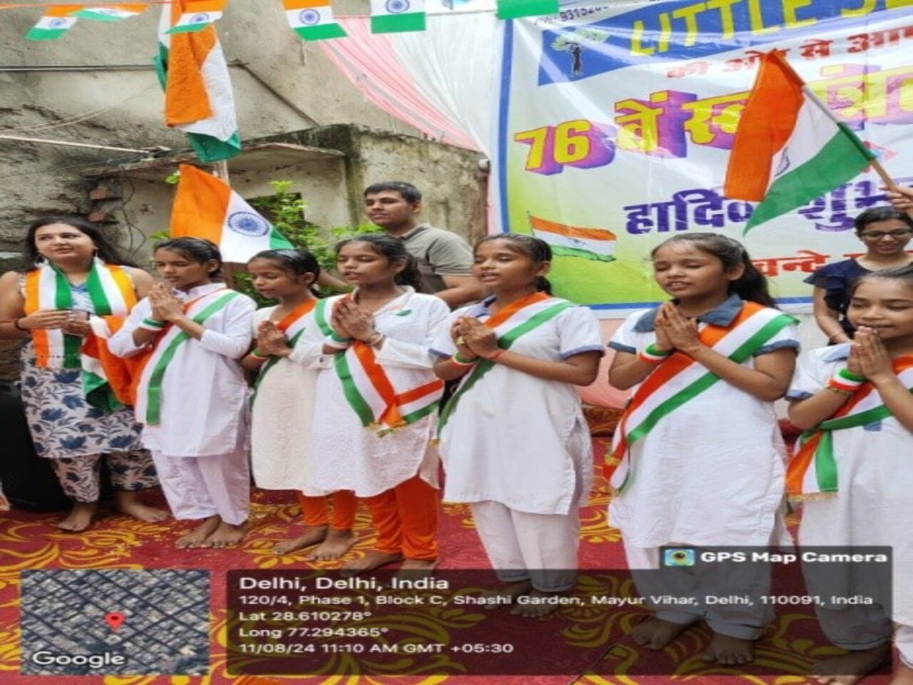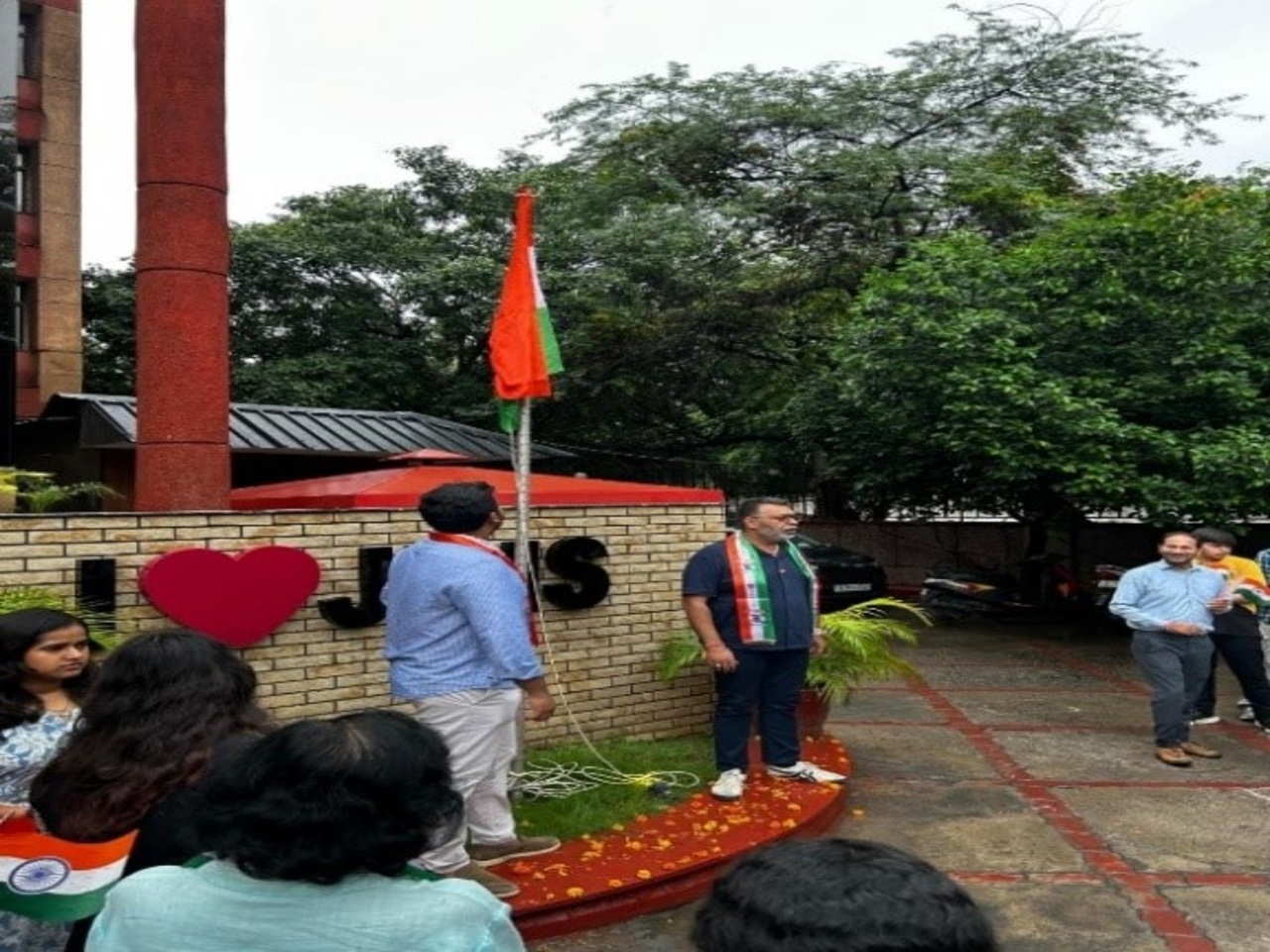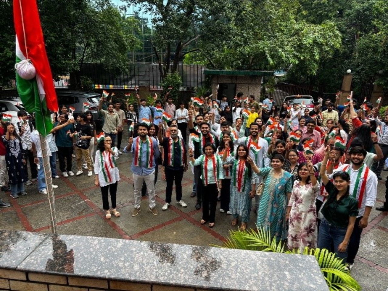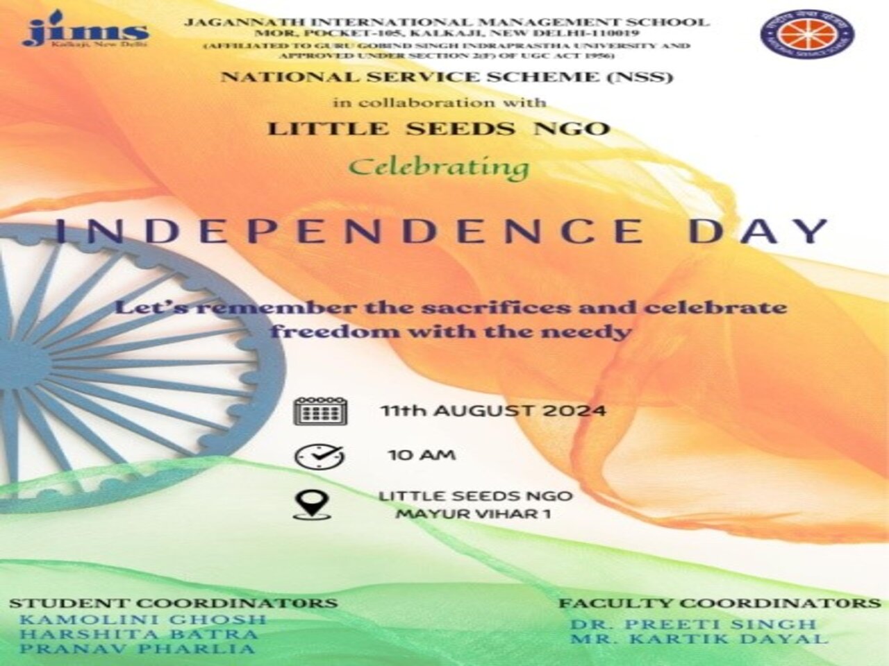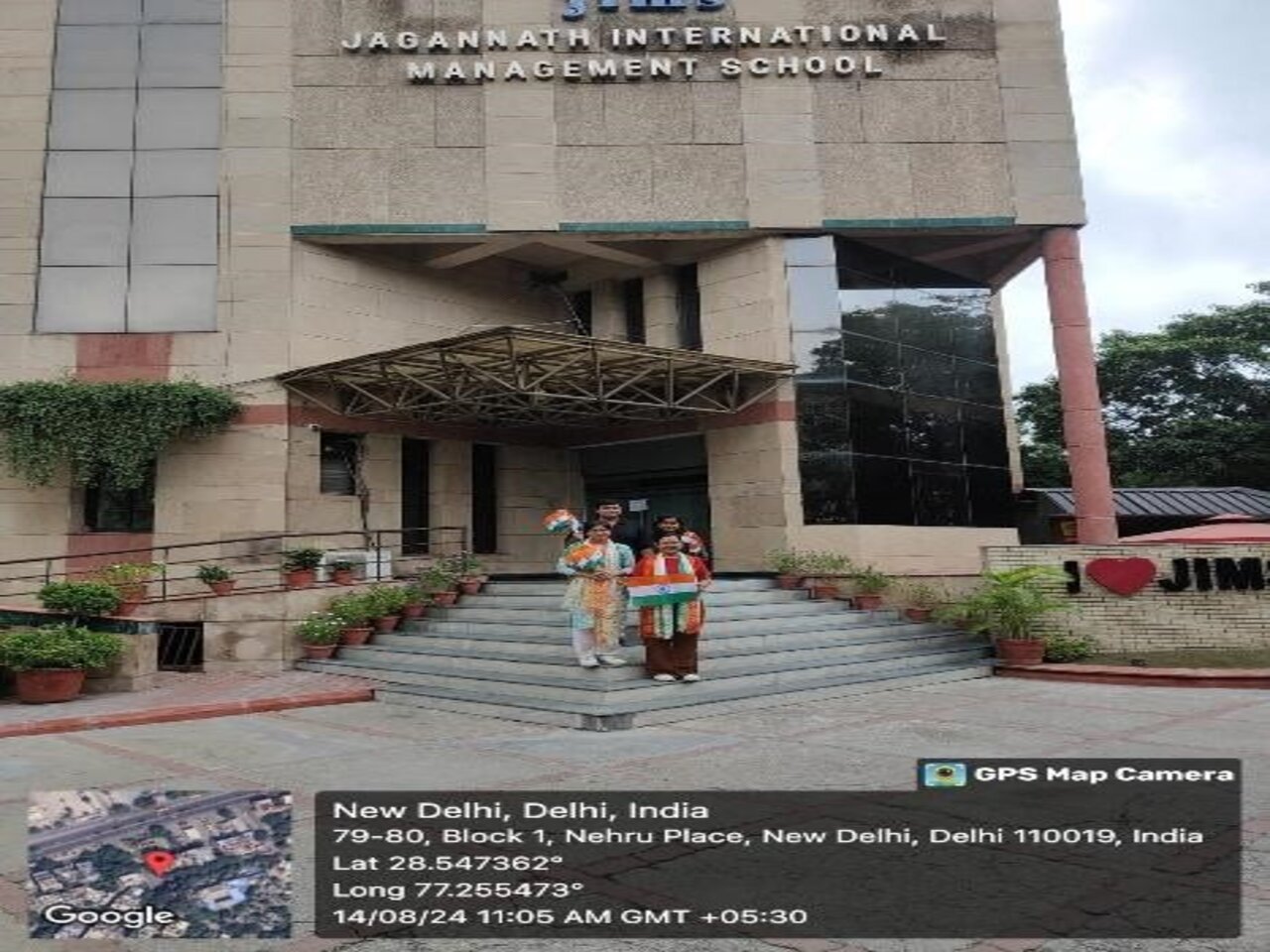 Prayaas, the NSS Club of JIMS Kalkaji, organised a Flag Hoisting Ceremony to mark the 79th Independence Day at JIMS Kalkaji on 14 August 2025. The campus was decorated with balloons, tricolour flags, and a handmade photo booth, while an artistic rangoli at the entrance enhanced the patriotic spirit.The highlight was the flag hoisting by the Honourable Director, followed by the National Anthem, which created an atmosphere of pride and respect. The event concluded with appreciation of the NSS volunteers, whose creativity and dedication made the celebration memorable. The celebration fostered a sense of national pride, unity, and respect for the sacrifices of freedom fighters. It enhanced the leadership, teamwork, and organisational skills of NSS volunteers while encouraging creativity through decorations and cultural activities.