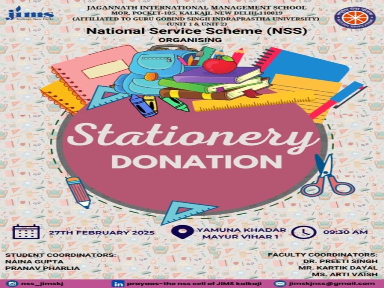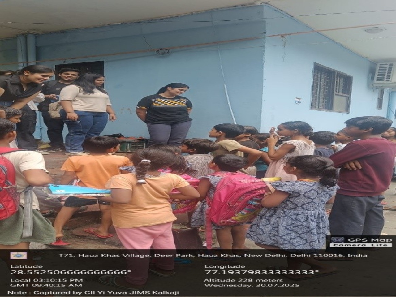 Prayaas- The NSS club of JIMS Kalkaji, took a meaningful step toward educational support by organizing a Stationery Donation Drive on 27 February 2025 in collaboration with Rotaract Club of JIMS Kalkaji at Yamuna Khadar, Mayur Vihar Phase 1. Understanding the challenges faced by children in underserved communities, we distributed over 50 sets of school bags and stationery items, including pencil boxes, colors, notebooks, and other essentials. We were honored to have esteemed guests from the Lalmani Foundation and United Nation Welfare Foundation, whose support and encouragement added great value to our initiative. Beyond distributing resources, the event was enriched with interactive activities, where the children showcased their talents through poetry recitations, songs, and dance performances. Their enthusiasm and gratitude made the event truly heartwarming. To ensure a holistic experience, refreshments were also provided, making the day enjoyable and memorable for the young learners.