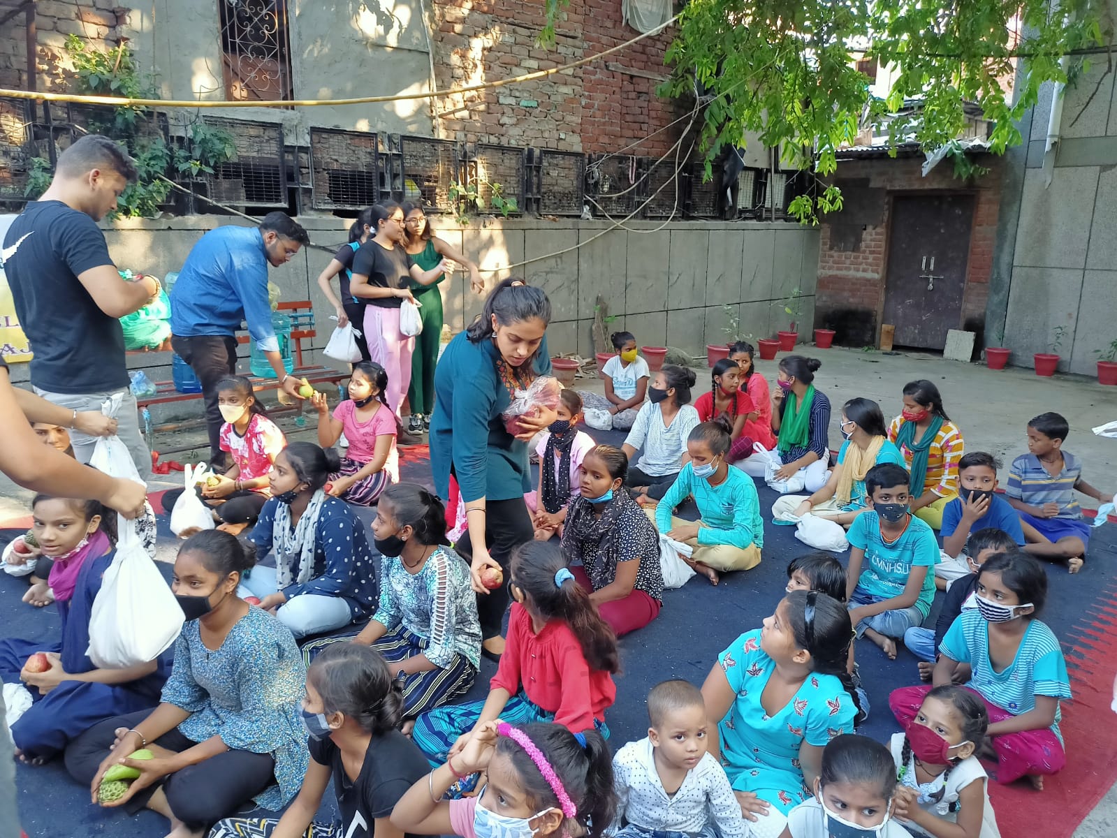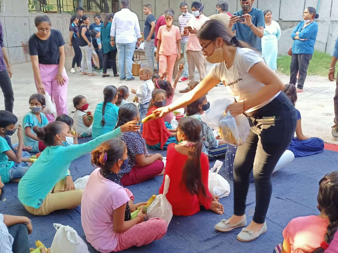 2) Thereby volunteers distributed nutritional kits (Pulses, rice, oats), biscuits, pear, apple and bananas.