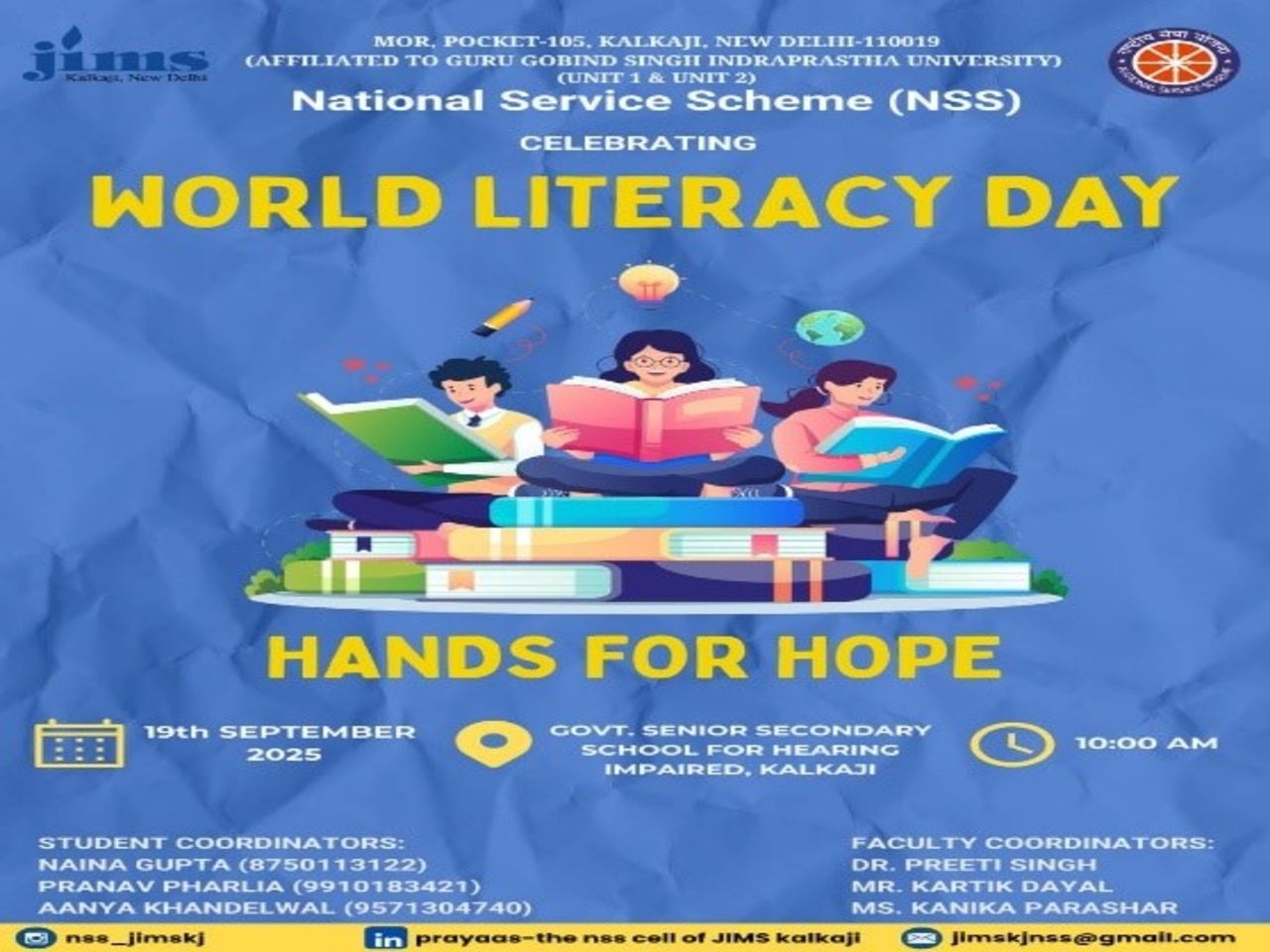 Prayaas- the NSS Club of JIMS Kalkaji, organized Hands for Hope celebrating the occasion of World Literacy Day at Govt. Senior Secondary Special School (Co-ed) for the Hearing Impaired, Kalkaji on 19 september 2025. The initiative aimed to spread awareness about the importance of literacy while fostering creativity among differently-abled children. The event began with interactive sessions where student volunteers engaged students in a series of creative activities. During the clay modelling activity, children shaped different objects using colourful clay, enhancing their creativity and motor skills. This was followed by a drawing activity, where they expressed their imagination on paper. Another fun segment involved a sticky-note wall, where students drew their favourite things; all notes were later displayed together, forming a vibrant Wall of Creativity and Hope. The event concluded with the distribution of refreshments, leaving the children delighted. The atmosphere was filled with joy, laughter, and togetherness, truly reflecting literacy as a tool of empowerment and expression. Volunteers learned how engaging activities like art and clay modeling could serve as powerful tools in encouraging creativity and literacy awareness. It emphasized that literacy extends beyond reading and writing—it is also about expressing oneself, sharing ideas, and connecting with others through creativity and compassion.
