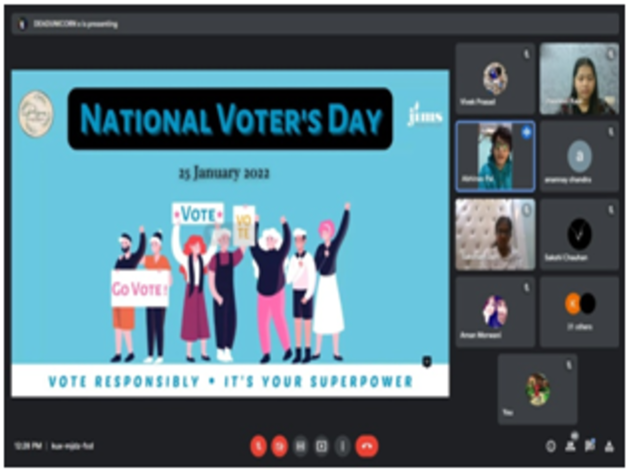 Prayaas, the NSS club of JIMS Kalkaji, had actively participated in the Delhi Election Quiz from 21st January to 23rd January 2025 2025, an initiative by the government to enhance awareness of social responsibilities. Following the quiz, students took a pledge within the college to uphold the values of social responsibility and awareness. To further extend the impact of the campaign, students organized a poster drive, creating awareness on critical issues. Posters were strategically placed across the campus, ensuring maximum visibility and engagement. This encouraged peers to take part in the cause, fostering a culture of responsibility and civic awareness within the college.