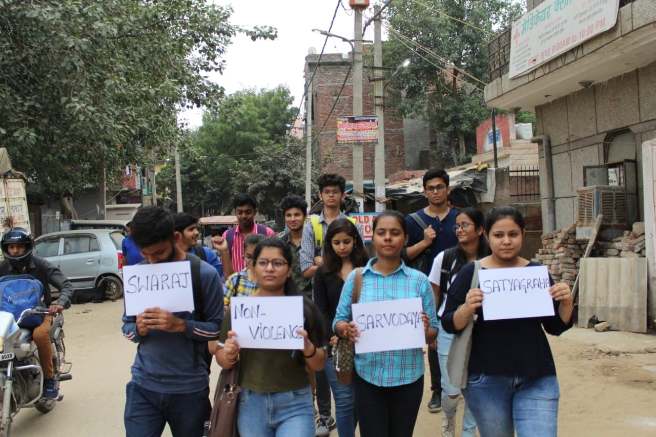 Pad Yatra is a journey undertaken by politicians or prominent citizens to interact more closely with different parts of society, educate about issues concerning them, and galvanize his or her supporters. Pada Yatras or 'Foot pilgrimages' are also Hindu religious pilgrimages undertaken towards sacred shrines or pilgrimage sites. Mahatma Gandhi originated the pad yatra with his famous Salt March to Dandi in 1930. In the winter of 1933-34, Gandhi went on a countrywide pad yatra against untouchability Later, Gandhian Vinoba Bhave also started a pad yatra, which was part of his Bhoodan Movement in 1951. Starting from Telangana region, Bhave concluded his Pad yatra at >Bodh Gaya.On 6 January 1983. Chandra Shekhar started his pad yatra from Kanyakumariand continued his 4260 km journey to Raj Ghatin Delhi till 25 June1983 to understand the problems of masses. The purpose of doing the Pad Yatra journey is that it sets up an example for the rest of the world to build our relationship to nature as well as with different sections of the society. With this objective in mind, the NSS wing of JIMS Kalkaji organized a Pad Yatra in Kalkaji Locality on 9th October 2019 to create awareness about Gandhian Ideologies of truth, non-violence, swaraj, etc. Students participated enthusiastically and made the event a success