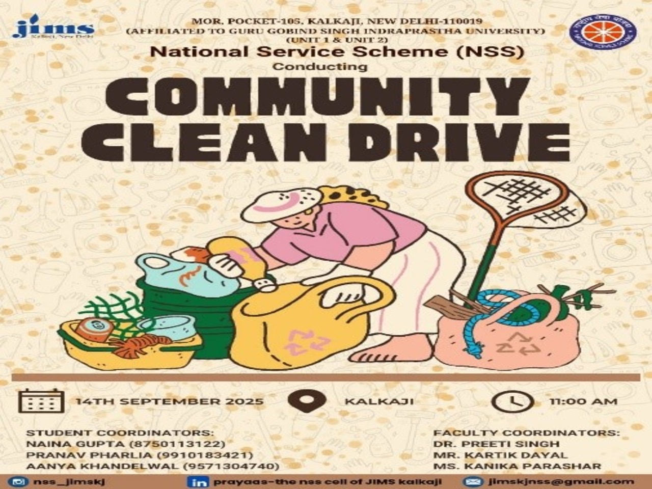 Prayaas- the NSS Club of JIMS Kalkaji, organized a two-day cleanliness campaign named “Mission Swachhata: Act, Create, Commit” as part of Swachhata Pakhwada on 14-15 September 2025. On the first day, a cleanliness drive was held in collaboration with Selfless Sewa NGO near Dr. B. R. Ambedkar School of Specialised Excellence, Kalkaji, to promote hygiene and community awareness. NSS volunteers actively participated in cleaning the surroundings and encouraging residents to adopt hygienic practices, emphasizing the importance of collective responsibility in maintaining cleanliness. On the second day, a Swachhata Pledge was administered in classes to remind students of their duty towards a clean environment. A handmade poster-making competition was also organized, and the posters were displayed across the campus to inspire others and spread the message of Swachh Bharat. The campaign effectively combined action and awareness, fostering a sense of responsibility, teamwork, and environmental consciousness among students while reinforcing their commitment to the ideals of the Swachh Bharat Abhiyan.