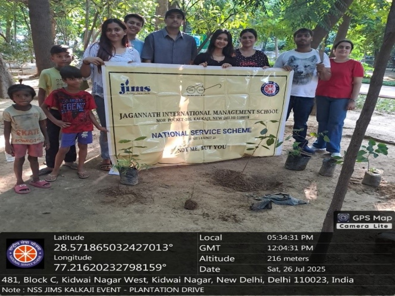 Prayaas, the NSS Club of JIMS Kalkaji, organized a Tree Plantation Drive at East Kidwai Nagar, Delhi on 26th july 2025. The event began with a brief orientation where volunteers were guided on the planting procedure and location allocations. With active participation and commitment, the volunteers successfully planted over 100 saplings in areas lacking greenery. From digging pits to watering and securing the saplings with, students worked diligently and collaboratively throughout the activity. The drive witnessed enthusiastic participation and strong teamwork. The presence and appreciation of local residents further boosted the morale of the volunteers and added significance to the cause. The initiative not only contributed to improving the green cover but also encouraged students to be environmentally responsible citizens. Students experienced hands-on environmental service and saw the direct impact of their efforts and gained awareness of the importance of tree plantation for sustainable development. The activity enhanced the coordination, teamwork, and sense of civic responsibility of the student volunteers.