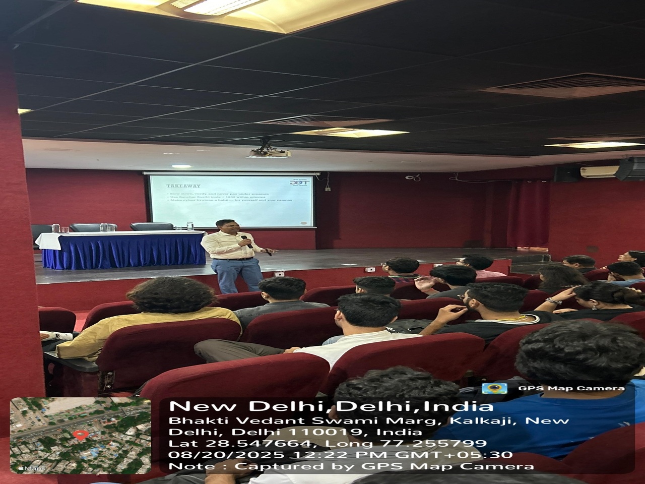 A seminar on Cyber Safety Awareness & DoT Initiatives was organized by JIMS Kalkaji on 20th August 2025 in the college auditorium for B.Com (H) III & V Semester students.The distinguished speaker for the session was Shri Ankit Shukla, Assistant Director General (Security), Department of Telecommunications.	Shri Shukla shared insightful knowledge about the current challenges in the field of cyber security, emphasizing risks such as data breaches, phishing, identity theft, and online fraud.	He explained the initiatives of the DoT to enhance cyber safety, including awareness campaigns, security guidelines, and helplines to report cyber-related grievances.The speaker also highlighted practical measures for students, such as safeguarding passwords, verifying online sources, and avoiding suspicious links.The seminar was interactive, with students actively engaging in a Q&A session and seeking clarity on issues they face in their daily digital interactions.The event concluded with the faculty coordinators appreciating the speaker’s efforts and encouraging students to adopt safe online practices in their academic and personal lives.