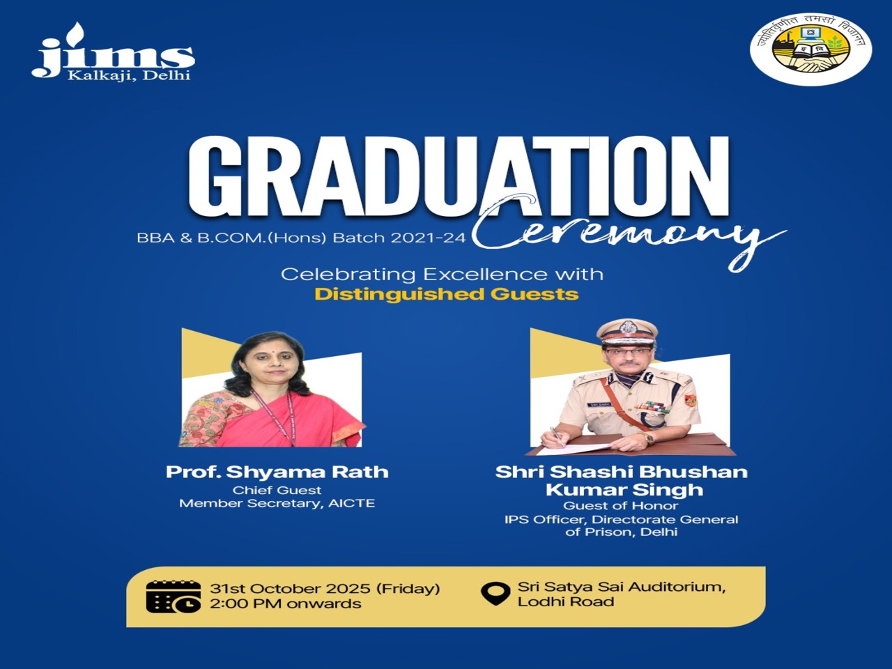 The Graduation Ceremony for the batch of 2021–2024 was held with grandeur at Jagannath International Management School,Kalkaji, New Delhi. The event celebrated the academic achievements of students from BBA and B.Com (H) programs. Distinguished dignitaries including Prof. Shyama Rath, Shri Shashi Bhushan Kumar Singh, Dr. Amit Gupta, Dr. Meenakshi Narula, and Dr. Anuj Verma graced the occasion. A ceremonial plant was presented as a token of gratitude and sustainability. The event fostered a spirit of achievement, reflection, and new beginnings. The venue, Sri Sathya Sai Auditorium, echoed with applause and pride as students took the next step in their professional journey.The ceremony emphasized JIMS' commitment to nurturing future leaders, culminating in a heartfelt Vote of Thanks by Dr. Anuj Verma, Director JIMS Kalkaji. Congratulations to the graduates on their remarkable achievements; best wishes for their future endeavors! JIMS .