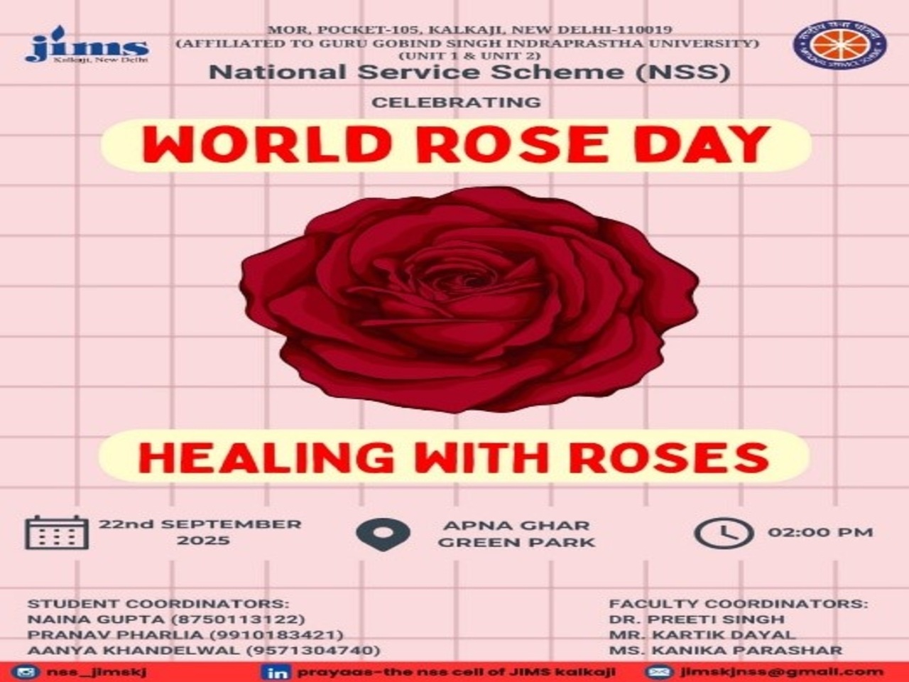 Prayaas- the NSS Club of JIMS Kalkaji, organized Healing with Roses at Apna Ghar, Green Park, to commemorate World Rose Day on 22 September 2025. NSS volunteers distributed handmade paper roses to the residents as tokens of love, strength, and positivity. To creatively engage the elderly, a thumb-painting session was conducted, allowing them to express their emotions through art. Simultaneously, children participated in drawing and painting activities, filling the atmosphere with colours of joy and imagination. To add a spirit of fun and liveliness, several interactive games were organized, followed by energetic dance performances by both volunteers and residents. The event fostered an atmosphere of warmth, compassion, and togetherness, creating beautiful moments of emotional connection and shared happiness.