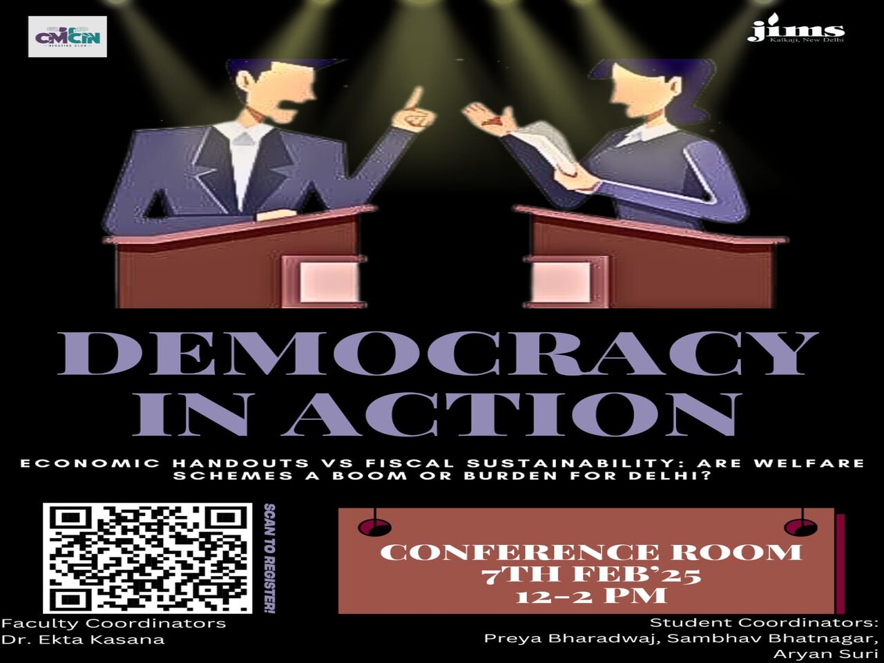 JIMS Kalkaji took the initiative of organizing a debate competition on the topic "Economic Handouts vs Fiscal Sustainability: Are Welfare Schemes a Boon or Burden for Delhi? " by Communicon (The Debate Society of JIMS Kalkaji). This event, held on 7 February 2025, was a vibrant showcase of diverse perspectives and creative expressions. This debate competition was a valuable platform for students to engage in a constructive discussion on a critical issue affecting Delhi's economy.