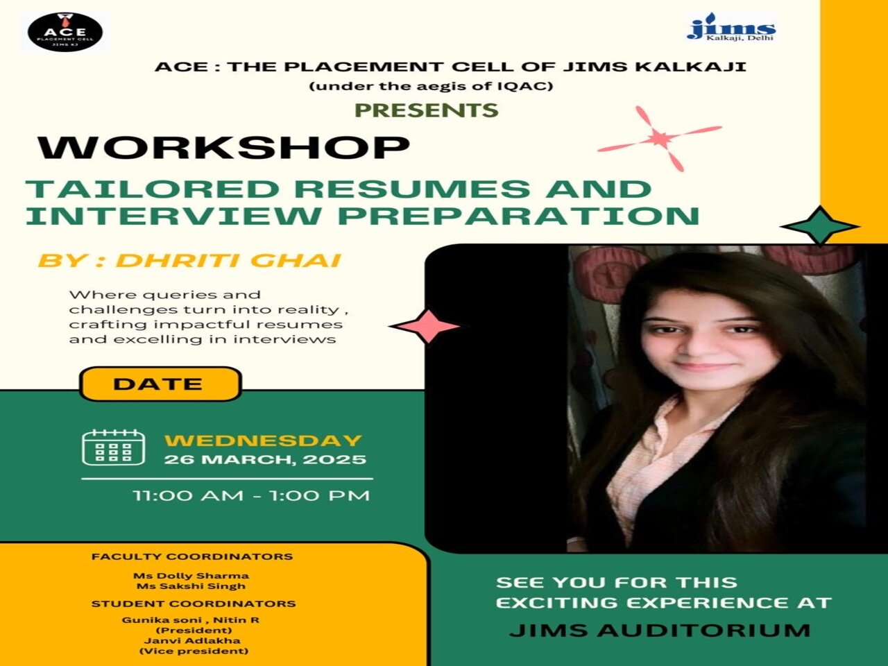 On 26th March 2025, ACE, the placement cell of JIMS Kalkaji, conducted a Tailored Resumes and Interview Preparation Session.The session focused on how students can optimize their resumes to match specific job descriptions and excel in interviews.Tailoring Resumes: Mr. Tarun emphasized the importance of aligning resumes with job descriptions, focusing on ATS optimization, using relevant keywords, and structuring resumes to highlight key skills and experiences.Interview Preparation: Ms. Dhriti Ghai covered strategies for researching about the company, and how to prepare answers of interview questions using STAR method, Quantifying method and more.