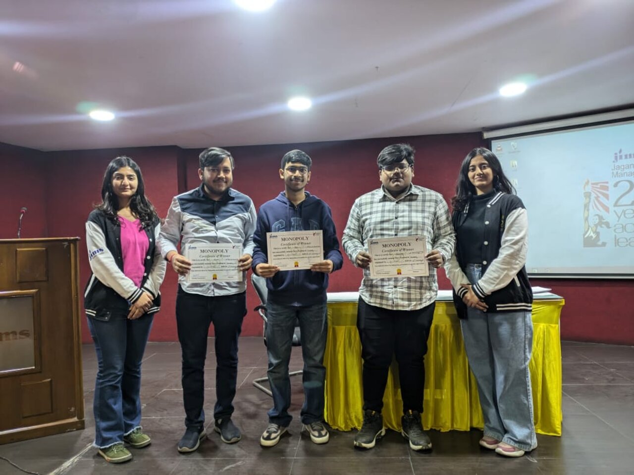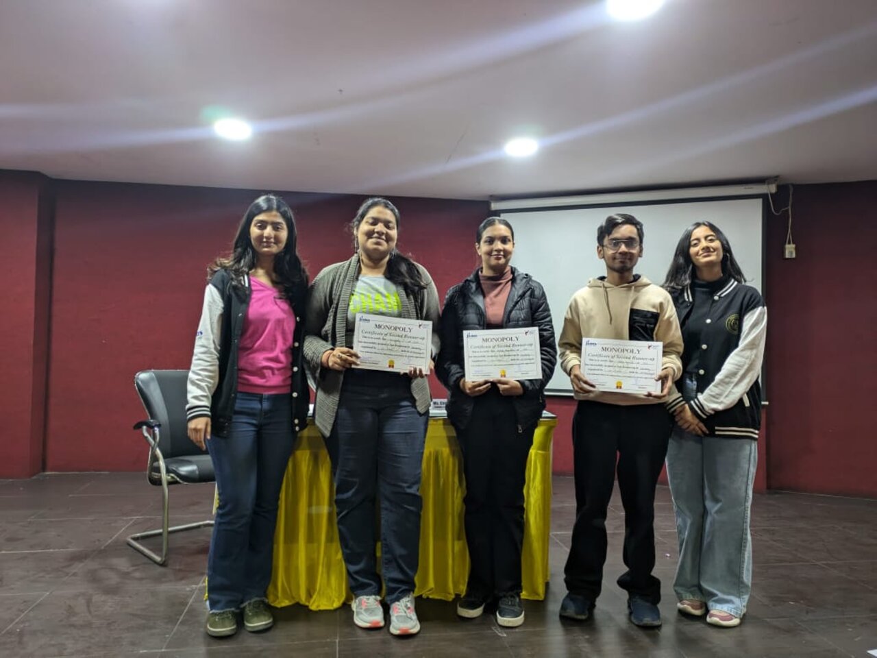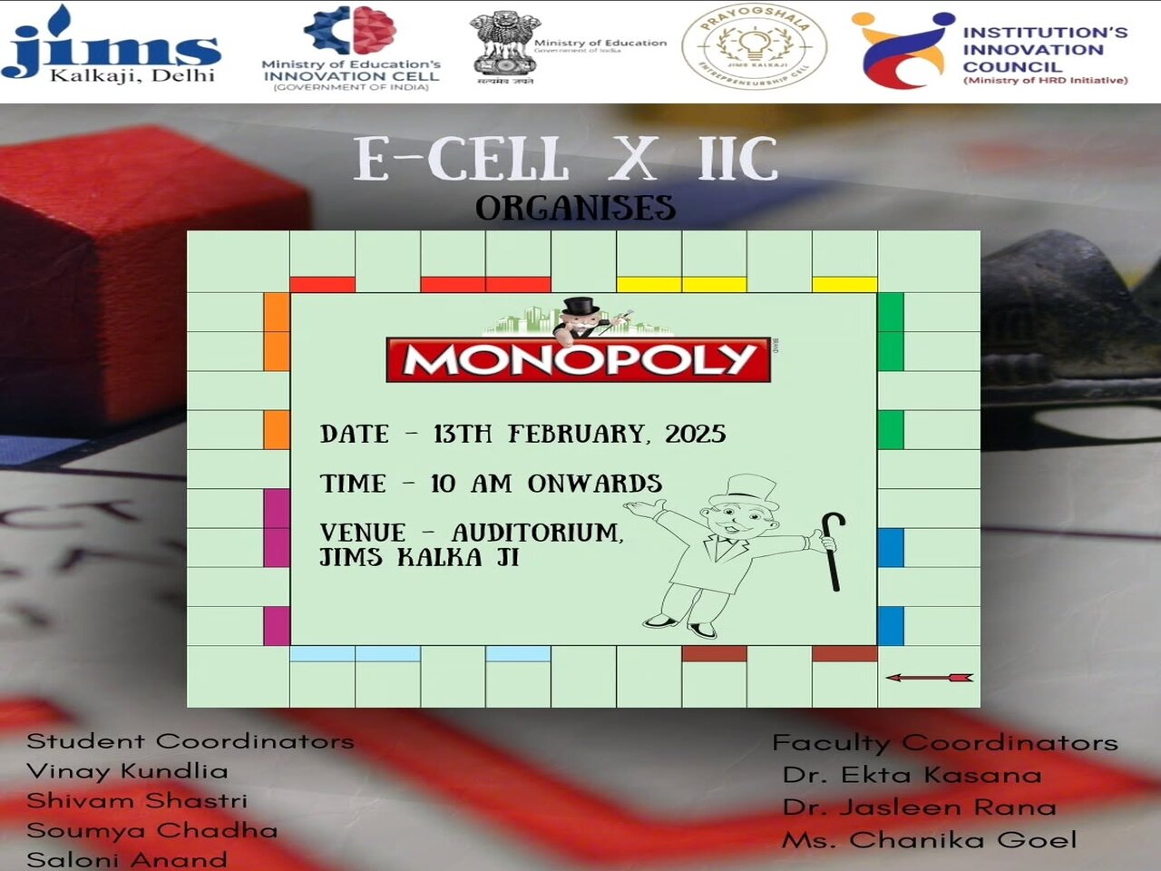 The Entrepreneurship Cell of JIMS, Kalkaji, in collaboration with IIC, organized an Entrepreneurial Monopoly on 13th February 2025 from 10 am onwards, led by Dr. Ekta Kasana, Ms. Chanika Goel (Faculty Coordinators), Shivam Shastri (Secretary), Soumya Chadha and Saloni Anand (Vice -Presidents of E-cell). The event aimed to enhance strategic thinking, financial management, and problem-solving through a simulated business environment. Participants tackled challenges, made investments, and managed resources, fostering skills in risk-taking, market analysis, and decision-making. With enthusiastic participation, the event successfully promoted entrepreneurial thinking and financial literacy, preparing students for real-world business scenarios.