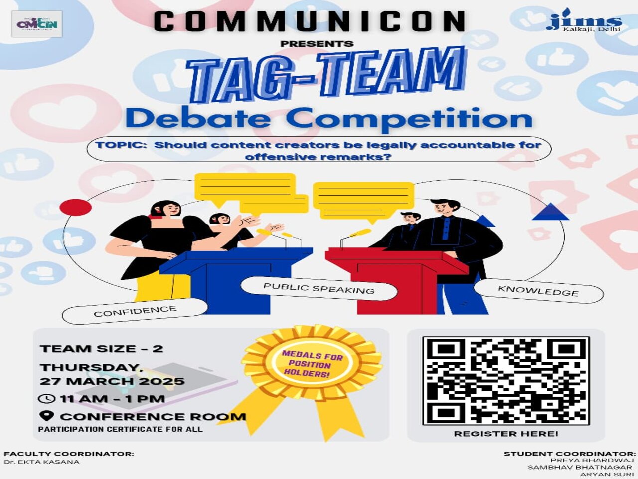 The BBA & BCOM Department of JIMS Kalkaji took forward the initiative of organizing a Tag- Team Debate competition on the topic "Should content creators be legally accountable for offensive remarks" by Communicon (The Debate Society of JIMS Kalkaji). This event was held on 27th March,2025 and was a vibrant showcase of diverse perspectives and creative expressions. The debate saw an energetic blend of voices, offering fresh insights and inspiring conversations. The students participated in the debate, which made them think out of the box, get out of their comfort zone, showcase teamwork and present their talents and unhinged opinions.