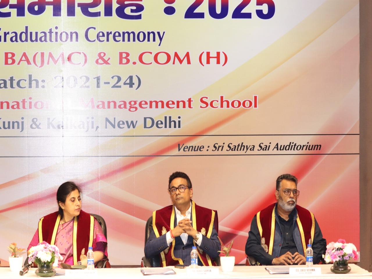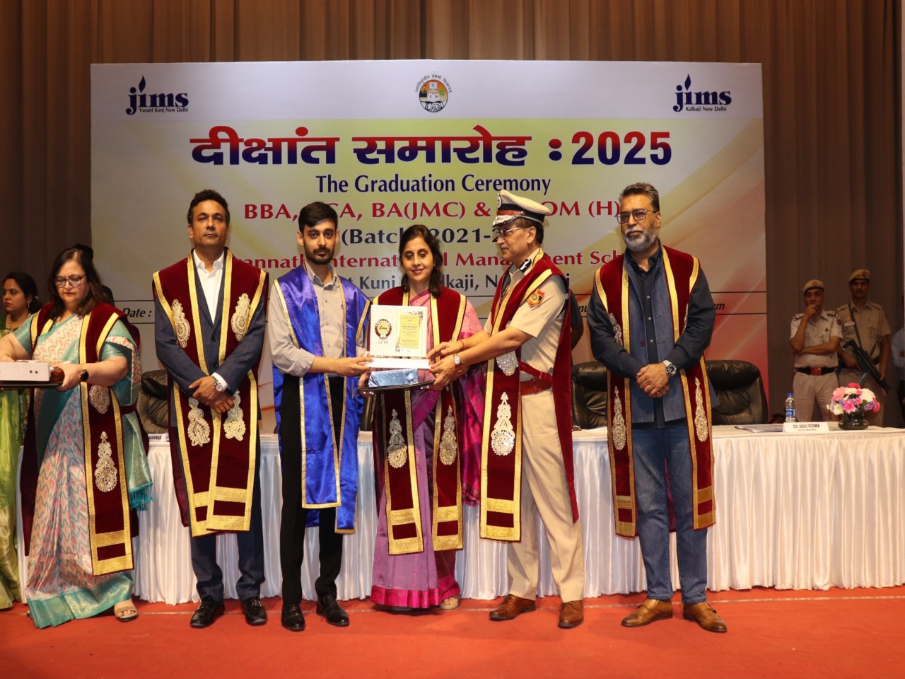 The Graduation Ceremony for the batch of 2021–2024 was held with grandeur at Jagannath International Management School,Kalkaji, New Delhi. The event celebrated the academic achievements of students from BBA and B.Com (H) programs. Distinguished dignitaries including Prof. Shyama Rath, Shri Shashi Bhushan Kumar Singh, Dr. Amit Gupta, Dr. Meenakshi Narula, and Dr. Anuj Verma graced the occasion. A ceremonial plant was presented as a token of gratitude and sustainability. The event fostered a spirit of achievement, reflection, and new beginnings. The venue, Sri Sathya Sai Auditorium, echoed with applause and pride as students took the next step in their professional journey.The ceremony emphasized JIMS' commitment to nurturing future leaders, culminating in a heartfelt Vote of Thanks by Dr. Anuj Verma, Director JIMS Kalkaji. Congratulations to the graduates on their remarkable achievements; best wishes for their future endeavors! JIMS .