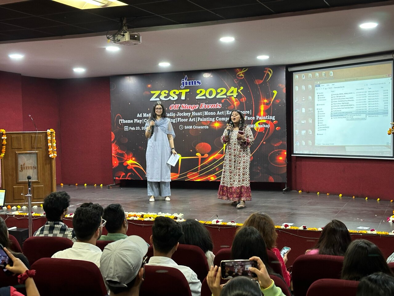 The on-stage events started by lighting of the Lamp to seek the blessing of Goddess Saraswati.Various on-stage events were: Solo-singing competition, Solo instrumental music, Duet Singing, Battle of Bands, Theme Play Segment, Solo Dance Competition, Duet Dance Competition, Group Dance, Fashion Show And Dandiya. Chairman of JIMS, Dr. Amit Gupta along with, Prof.(Maj.Gen) M.P.Singh (Director, Lajpat Nagar), Dr.(Col.)Rajan Anand Malik (Director,Greater Noida), Dr. Dhar (Director JIMS, Vasant Kunj), Dr. J.K Batra(Director, JIMS Kalkaji) and all HOD's from various campuses were present at the event.