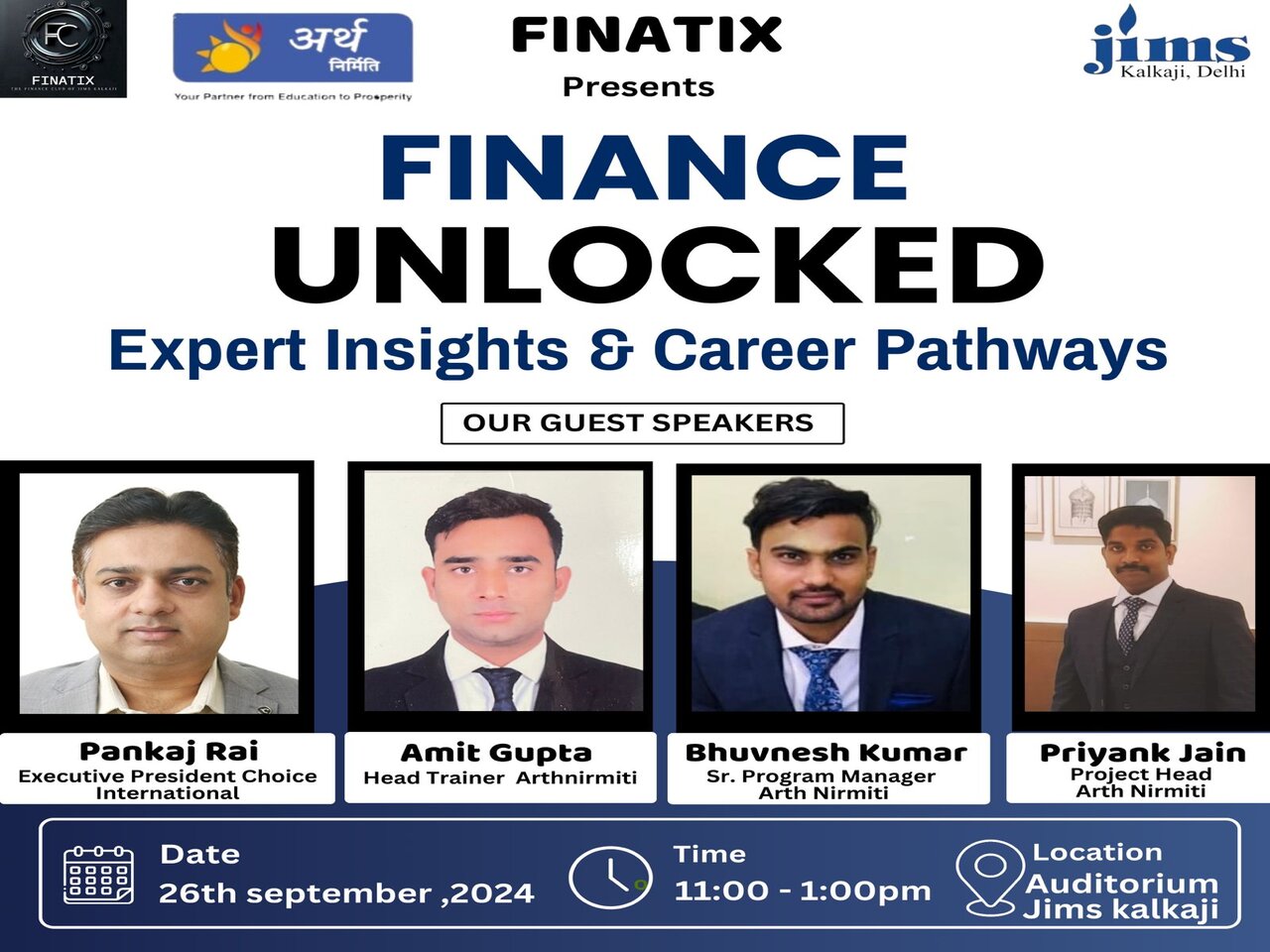 On the 26th of September 2024, Jims Kalkaji organized a guest lecture of four speakers at the Jims auditorium from 11:00 to 2:00 PM to enrich the knowledge of B.Com and BBA students on crucial financial and entrepreneurial topics. The event was designed to provide practical insights and foster creative thinking in areas pivotal for their academic and professional growth. The details of the speakers are as follows: 1. Pankaj Rai, Executive President, Choice International 2. Amit Gupta, Head Trainer, Arth Nirmiti 3. Bhuvnesh Kumar, Sr. Program. Manager, Arth Nirmiti 4. Priyank Jain, Project Head, Arth Nirmiti.