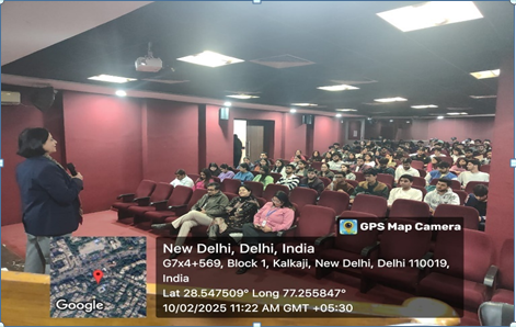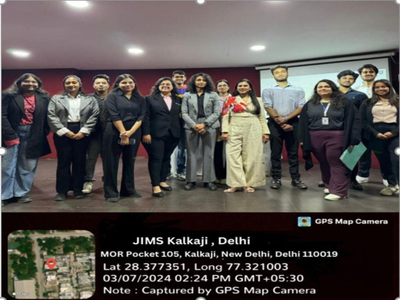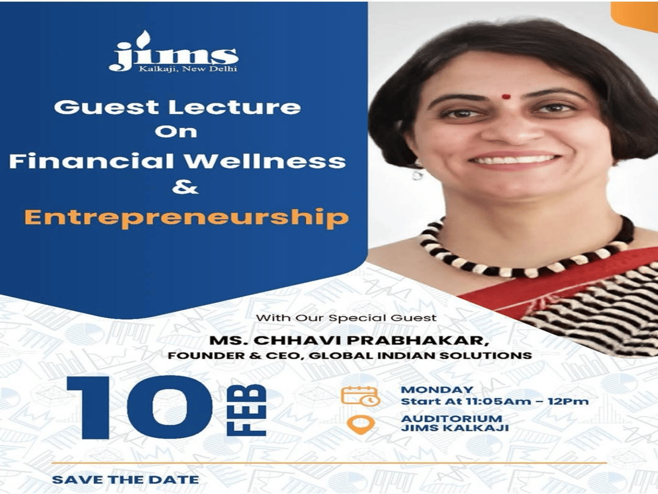 JIMS Kalkaji organized a guest lecture by Ms. Chhavi Prabhakar, founder & CEO of Global Indian Solutions on the topic "Financial Wellness & Entrepreneurship" on 10 February 2025. Ms. Chhavi Prabhakar emphasized financial planning, budgeting, and investment strategies for long-term stability. She discussed asset allocation, risk management, credit scores, and debt control. Transitioning to entrepreneurship, she shared insights on business challenges, market opportunities, and securing funding. She highlighted resilience, innovation, and leadership as essential entrepreneurial traits. The role of technology in startups and the regulatory landscape were also discussed. The session concluded with a Q&A, encouraging students to enhance their financial knowledge and entrepreneurial skills.