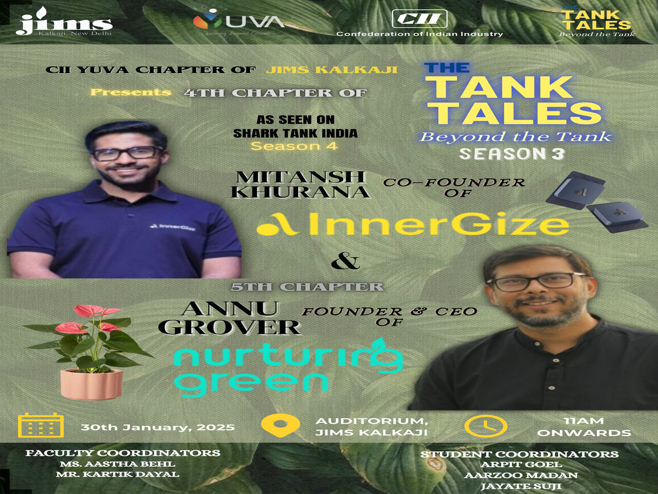 JIMS Kalkaji successfully organized a guest lecture on 30th January 2025 with Mitansh Khurana, the Co-founder of InnerGize and Mr. Annu Grover, Founder and CEO of Nurturing Green. Mr. Mitansh shared his inspiring journey of building InnerGize, an organization dedicated to empowering individuals through innovative wellness solutions. Similarly, Mr. Grover explained how the journey of Nurturing Green is driven by a passion for integrating nature into everyday life and adopting greener practices.