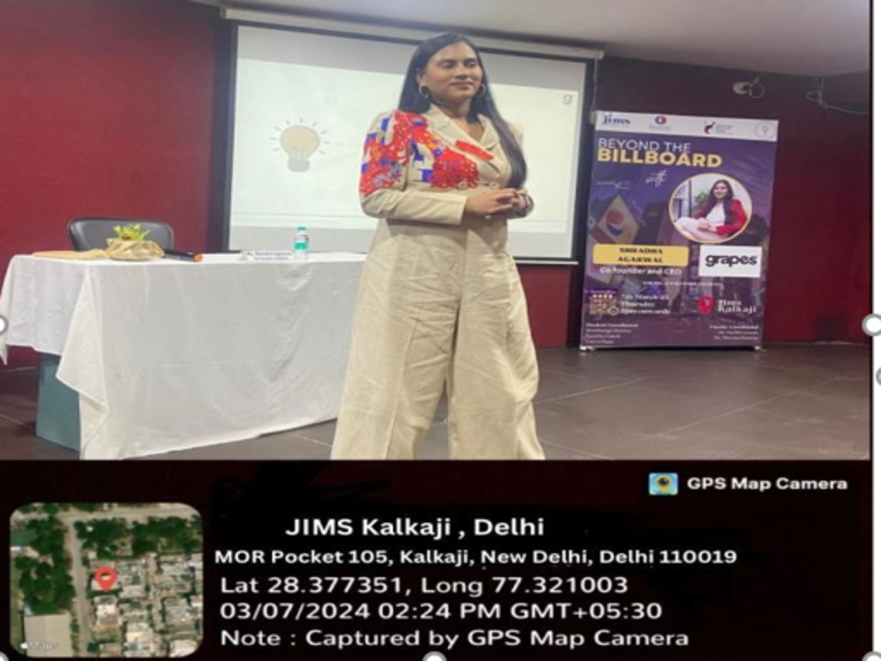 JIMS, Kalkaji, organised an exclusive speaker session on 7 th March 2024 with Shradha Agarwal, Co-Founder and CEO of Grapes, to offer a unique opportunity to delve into the dynamic world of digital marketing and entrepreneurship. The key highlights of the session: ❖ Shradha Agarwal shared her remarkable journey of passion, innovation and unwavering dedication in reshaping digital landscape. ❖ She offered valuable advice and practical tips to attendees. ❖ Shradha’s engaging presentation style captivated the audience, incorporating fun interaction and humorous anectodes to keep the environment lively and engaging.