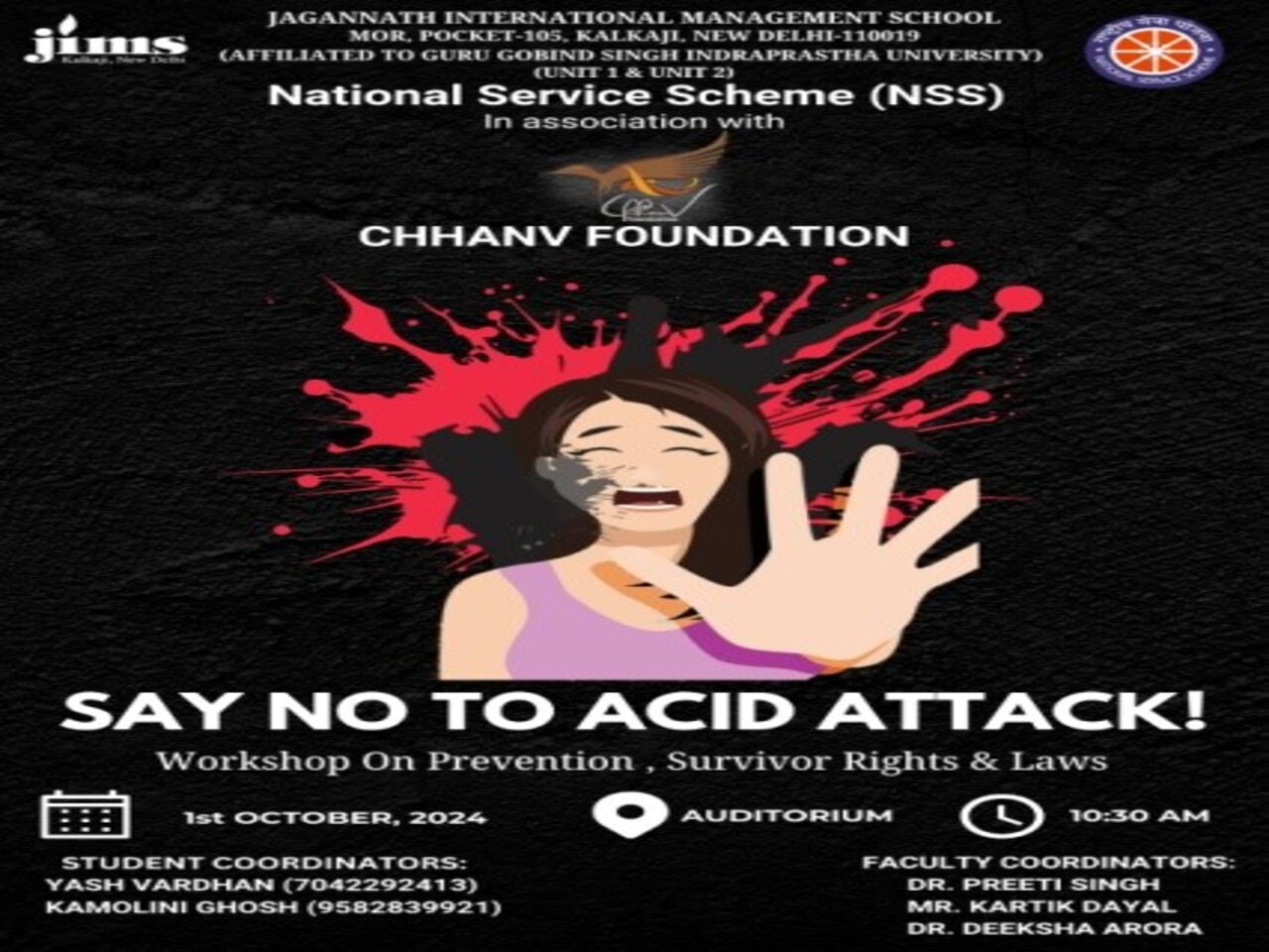 Acid Attack Prevention, Survivor Rights was held on 01-10-2024. Prayaas the NSS club of JIMS Kalkaji, has organized a workshop on "Acid Attack Prevention, Survivor Rights, and Legal Protections" in collaboration with Chhanv Foundation, a renowned NGO dedicated to supporting acid attack survivors. The session included an interactive Q&A, where participants posed insightful questions about the legal procedures in acid attack cases, the medical care available for survivors, and the role the community can play in preventing such attacks. Survivor stories shared during the session were deeply moving, offering participants a profound understanding of the emotional and physical challenges faced by survivors. It has increased awareness about acid attack prevention, legal recourse, and medical support amongst volunteers. Empowerment of participants through a deeper understanding of survivors' experiences and challenges.
