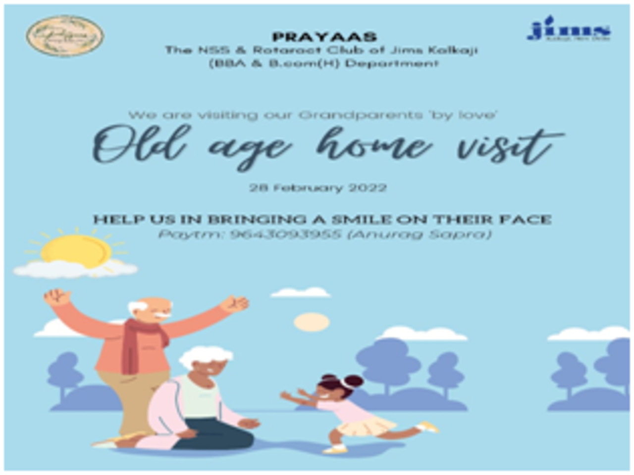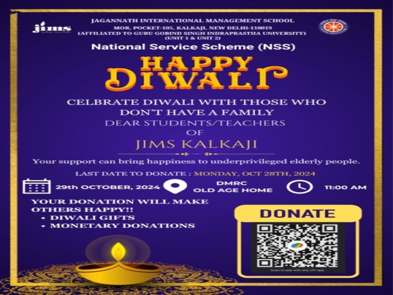 Project Sneh- Diwali celebration was held on 29-10-2024.Prayaas the NSS club of JIMS Kalkaji, had organized a Diwali celebration in collaboration with DMRC Old Age Home and Helpage India. This event fostered a sense of community and joy among the elderly residents, emphasizing social responsibility, respect, and intergenerational support. Volunteers connected warmly with the residents, who appreciated the thoughtful celebration and gifts, including shawls, electric kettles, Diwali hampers, fruits, socks, a copy of Ramayana, and diyas. By sharing the spirit of Diwali, we highlighted that the festival’s true essence lies in bringing light to others' lives, inspiring all participants to continue supporting the elderly community year-round. The aim is to spread the joy and warmth of Diwali by bringing the festive spirit to the elderly, making them feel valued and included. To foster respect, empathy, and understanding across generations, creating meaningful interactions between volunteers and the elderly.