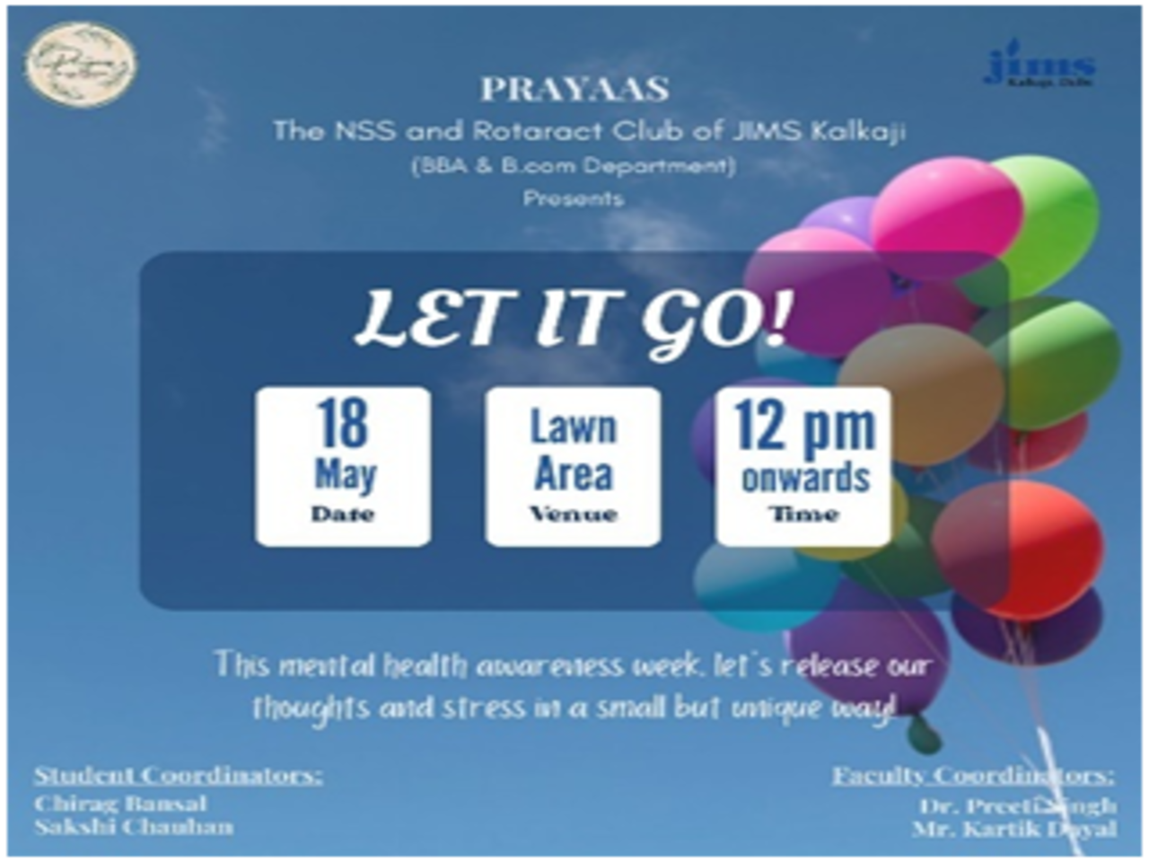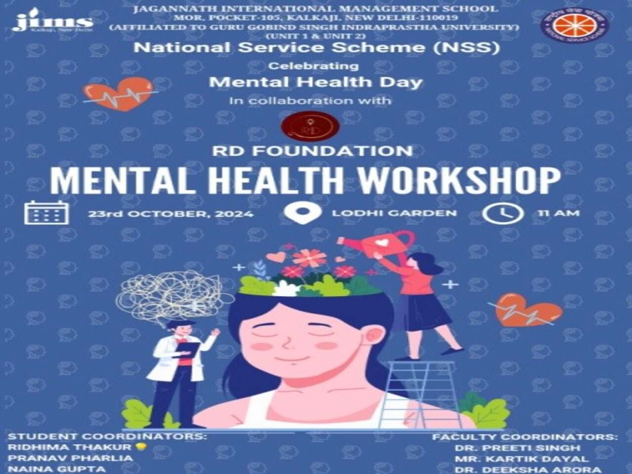 Mental Health Workshop was held on 23-10-2024. Prayaas the NSS club of JIMS Kalkaji, had organized a Mental Health Awareness workshop in collaboration with the RD Foundation. The workshop aimed to promote mental well-being among students and foster a supportive environment for discussing mental health topics. Psychologist Taanya Nagi led the session with various engaging activities, including breathing exercises, emotional regulation techniques, and interactive games, creating a lighthearted atmosphere that encouraged open participation. Participants explored several coping mechanisms for managing stress and anxiety, such as journaling as a therapeutic tool and tips for maintaining a balanced lifestyle. The session concluded with Dr. Taanya Nagi addressing specific questions and concerns regarding mental health. Understand core concepts of mental health and recognize common mental health disorders along with their symptoms Demonstrate effective coping mechanisms for managing stress and anxiety, including the implementation of mindfulness and breathing techniques for improved emotional regulation