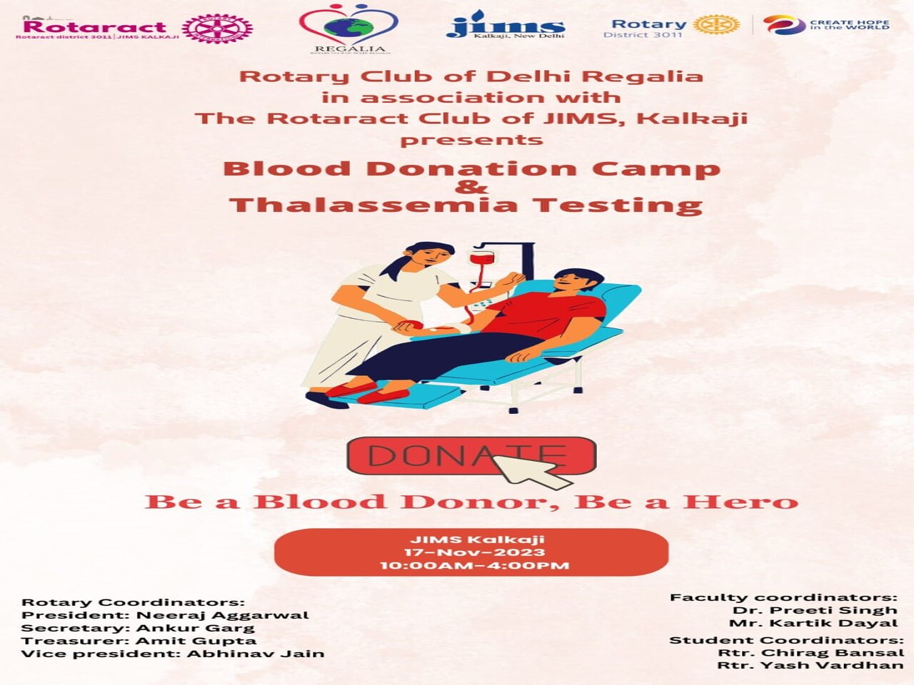 Blood Donation Drive was held on 26-11-2024.Prayaas The NSS club of JIMS Kalkaji organised A Blood Donation Camp in collaboration with the Rotaract Club of JIMS Kalkaji and Rotary Club of Delhi Regalia at JIMS Kalkaji Campus. The event saw an excellent response, with 51 units of blood collected. Donors were appreciated with certificates, fruits, juice, wallets, and memento cups. Conducted under the supervision of certified medical professionals, the camp adhered to strict hygiene protocols, successfully fostering community spirit and contributing to the noble cause of saving lives. The primary objective of the Blood Donation Camp was to encourage voluntary blood donation and create awareness about its significance in saving lives. The event aimed to provide a safe and efficient platform for donors to contribute to society while ensuring their well-being and comfort during the process .