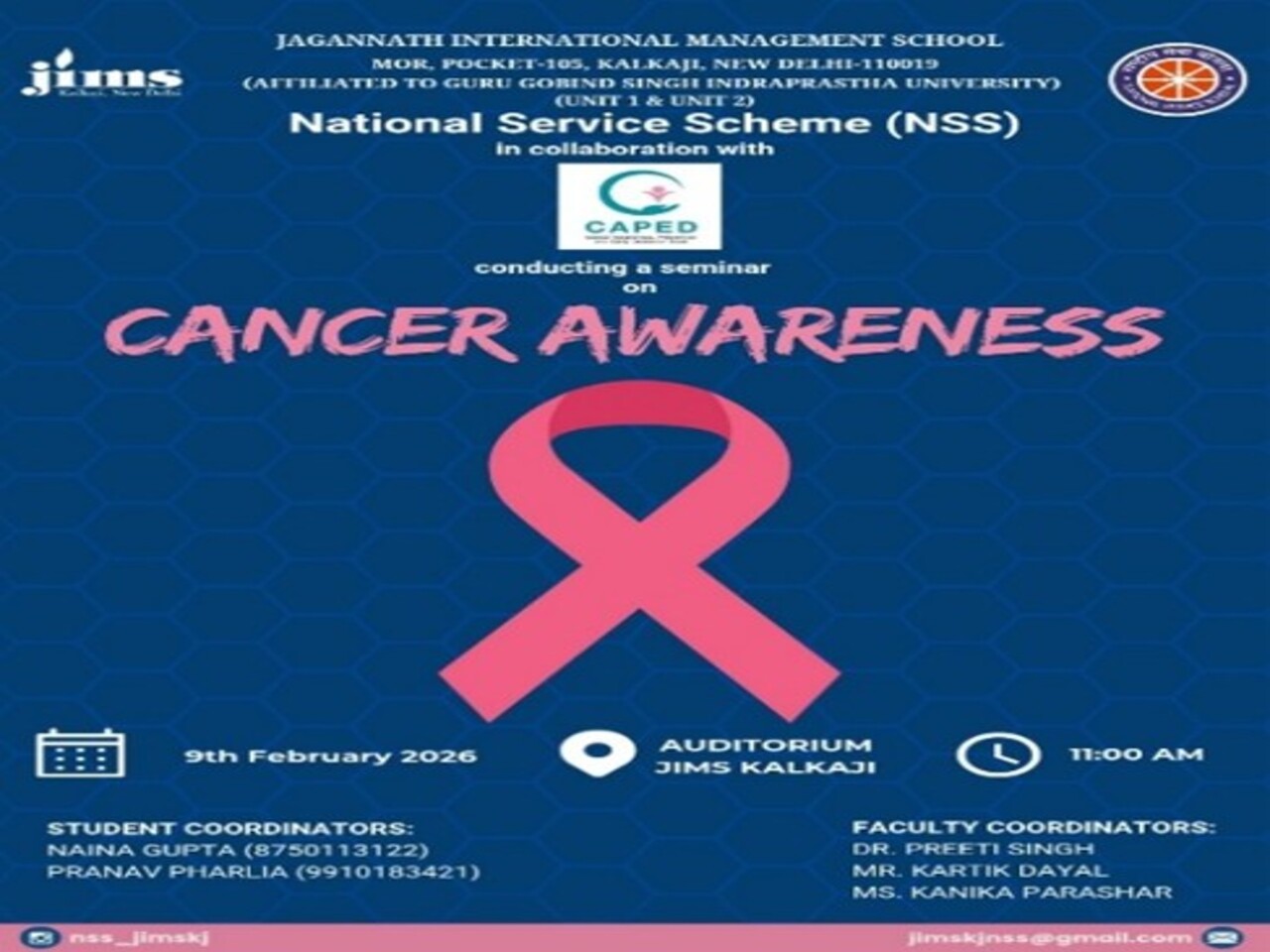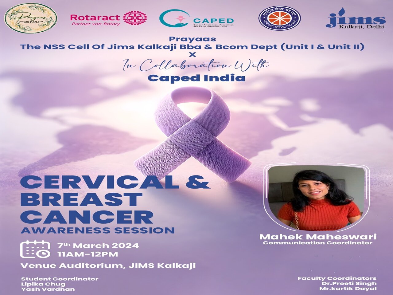 Prayaas the NSS club of JIMS Kalkaji, had organized an online poster making competition on 4th Feb 2025 on the occasion of World Cancer Day aimed at spreading awareness about cancer and its impact. The competition invited participants from all the willing students of college to showcase their creativity and understanding of the cause through visual art. The event was conducted virtually, allowing participants to submit their artwork online. The competition saw an overwhelming response, with numerous entries displaying thought-provoking messages, artistic skills, and innovative ideas. The posters highlighted themes such as the importance of emotional support for the patients and survivors. The competition provided a creative platform for participants to visually express the significance of cancer awareness, prevention, and support. Through their artwork, participants not only deepened their own understanding of the disease but also contributed to spreading vital messages to a wider audience.