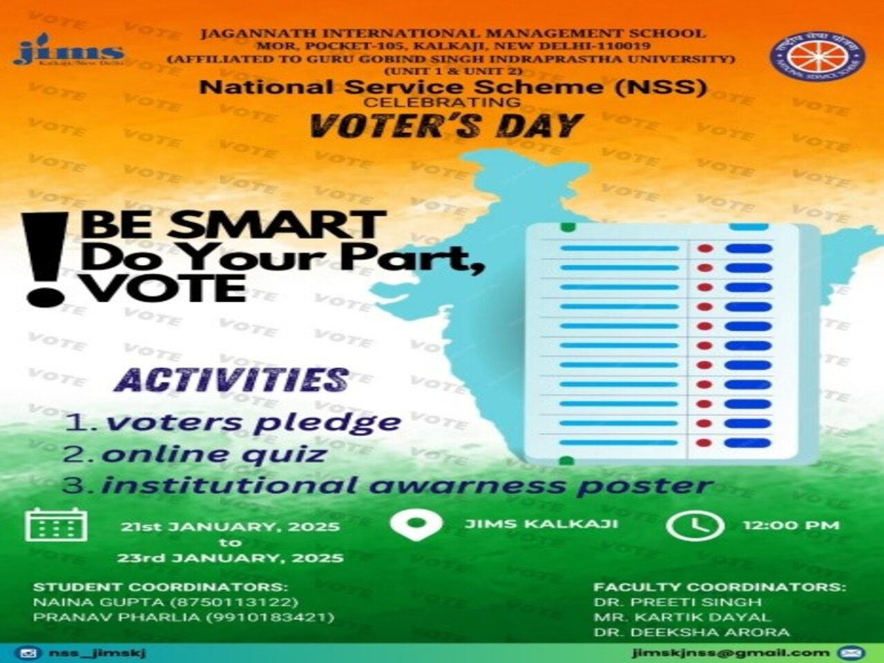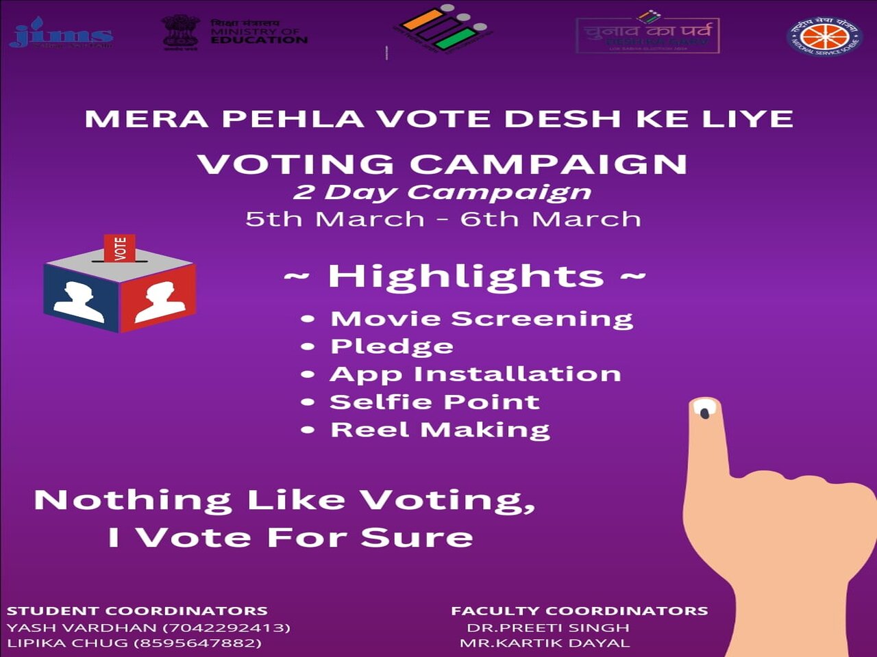 Prayaas, the NSS club of JIMS Kalkaji, had actively participated in the Delhi Election Quiz from 21st January to 23rd January 2025 2025, an initiative by the government to enhance awareness of social responsibilities. Following the quiz, students took a pledge within the college to uphold the values of social responsibility and awareness. To further extend the impact of the campaign, students organized a poster drive, creating awareness on critical issues. Posters were strategically placed across the campus, ensuring maximum visibility and engagement. This encouraged peers to take part in the cause, fostering a culture of responsibility and civic awareness within the college.