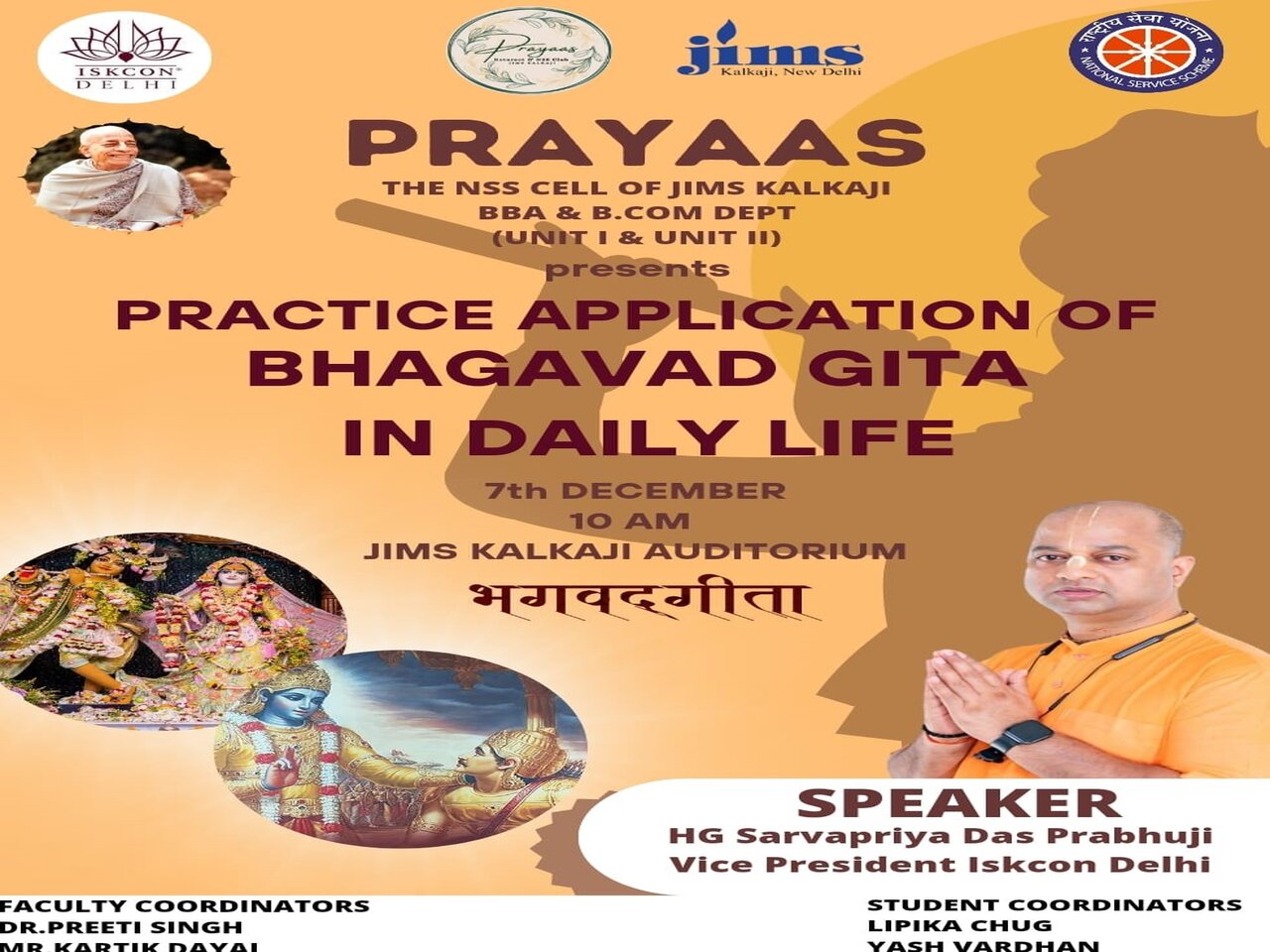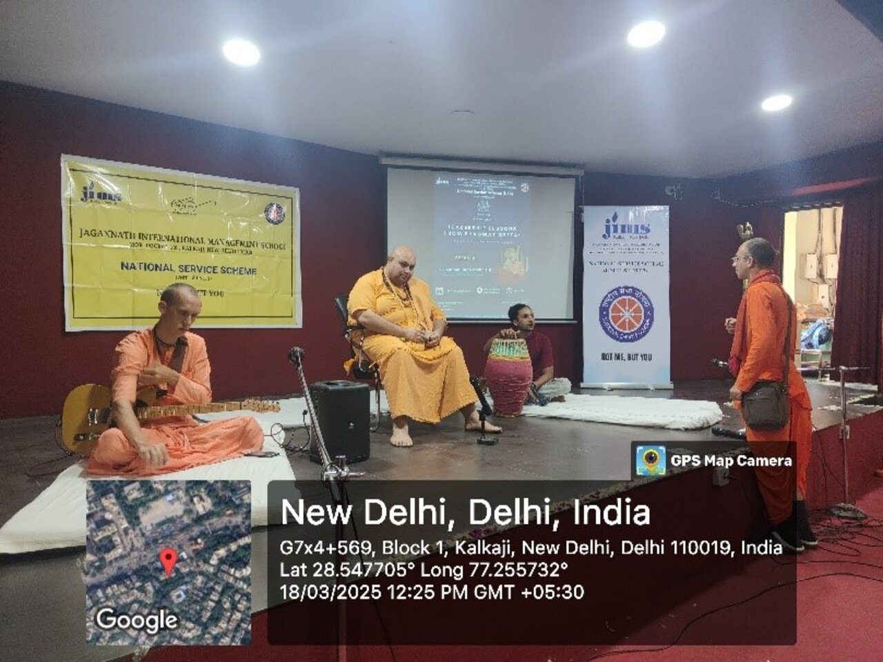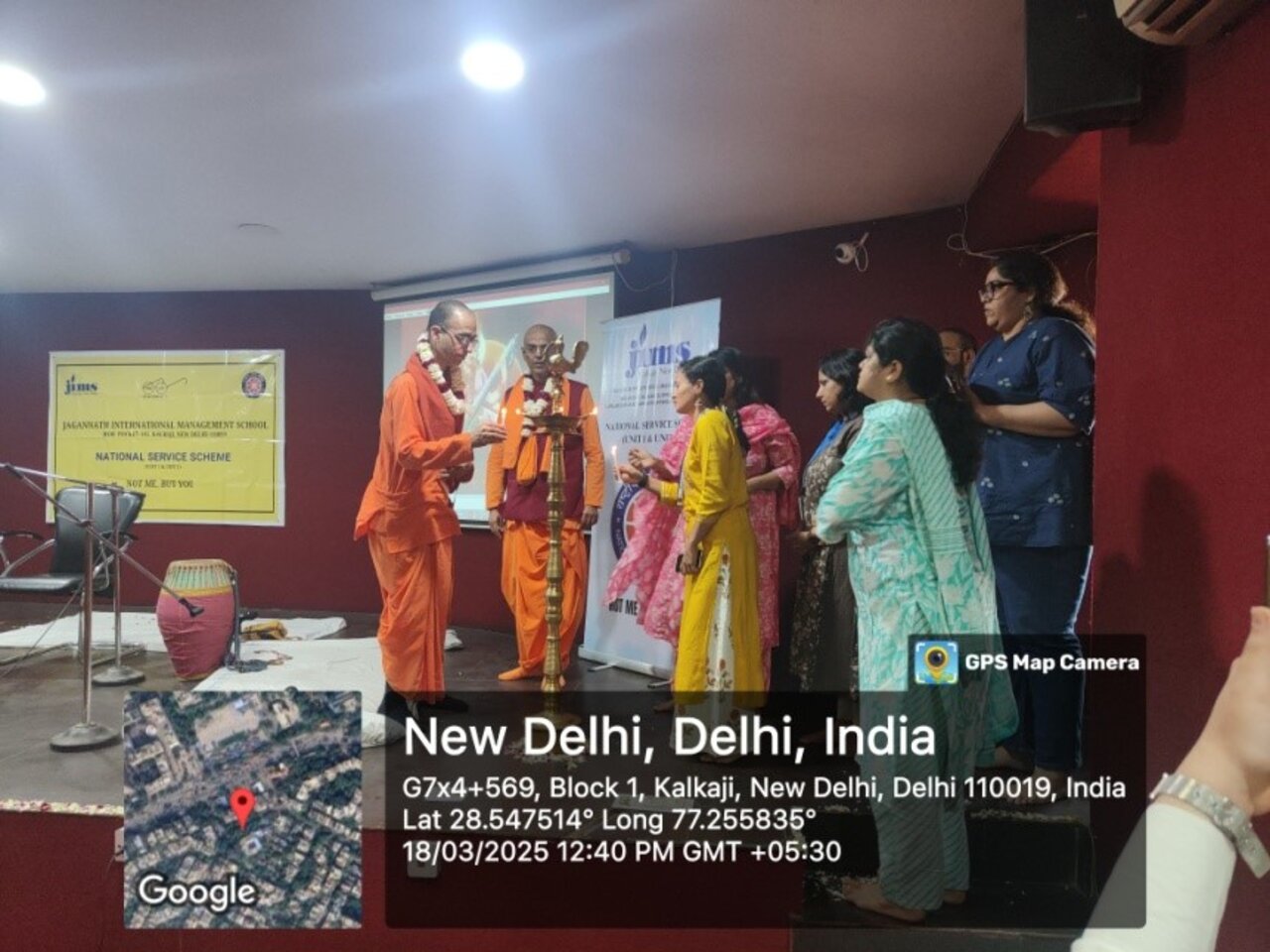 Prayaas the NSS club of JIMS Kalkaji, had organized a seminar on "Leadership Lessons from the Bhagwat Geeta: Timeless Insights for Today’s Leaders " on 18 March 2025. The session was honored by the presence of HG Mohan Rupa Prabhu Ji, President, ISKCON, East of Kailash, who shared profound teachings from the Bhagwat Geeta, illustrating their significance in contemporary leadership. During the session, emphasized the importance of selfless service, emotional intelligence, resilience, and ethical decision-making—qualities that are instrumental in leadership across various fields. He provided real-life examples and practical applications of these virtues, helping students understand how spiritual wisdom can be effectively integrated into modern leadership challenges. The seminar concluded with a soulful kirtan led by ISKCON devotees, creating an atmosphere of devotion and positivity.