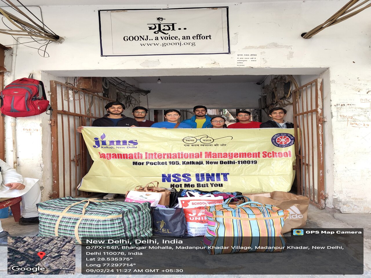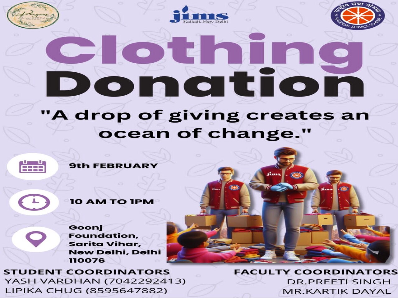 Clothes Donation Drive was held on 27-11-2024.Prayaas the NSS club of JIMS Kalkaji in collaboration with the Confederation of Indian Industry (CII) YUVA of Jims Kalkaji, organized a Clothes Donation Drive at Goonj. The initiative invited participants to contribute their gently used or new clothes to support those in need. The event provided a unique opportunity to explore the workings of Goonj, where attendees gained insight into how donations were repurposed to create meaningful impact. Additionally, an Awareness Session was held, during which participants learned about Goonj's innovative initiatives and its crucial role in addressing pressing societal challenges. The event successfully engaged everyone and contributed to this noble cause. The objective of clothes donation is to provide clothing to those in need, promote sustainability by reducing waste, engage communities in charitable acts, and support local charities or organizations in their efforts to help others.