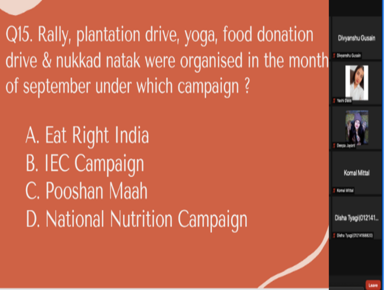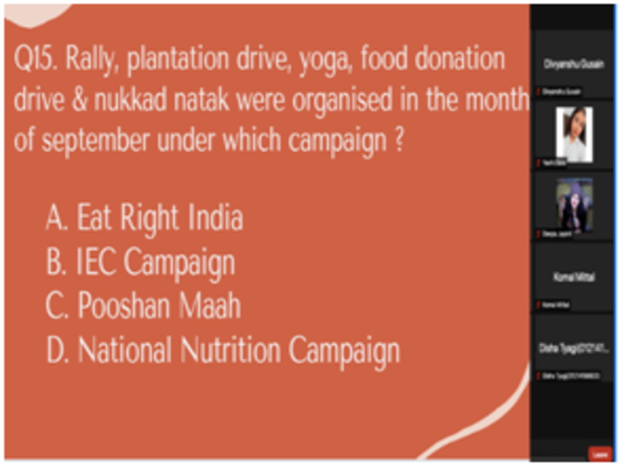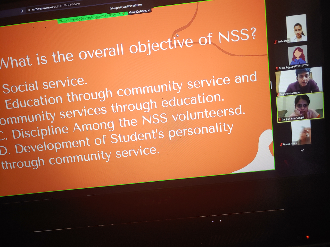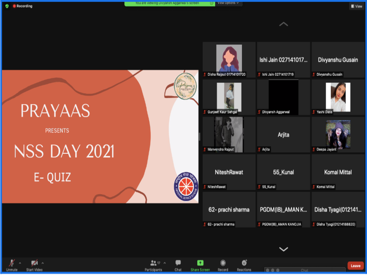 Every year, NSS day is observed on September 24 across India. ‘NSS Day’ and 4th Week of Poshan Maah 2021 was celebrated by volunteers by organizing E-Quiz on the theme “Nutrition” . 20 participants participated from UG and PG Departments. Disha Rajput, Divyansh Aggarwal, Ishi Jain were the event coordinators. The quiz included questions related to Nutrition, NSS and welfare schemes provided by the government in our country. The Winners of the E-Quiz are as under: 1. Mitul Kapoor – 2nd year BCom (H) M 2. Pradeep Singh Yadav – 2nd year BBA M 3. Manvendra Pratap Singh – 1st year PGDM M