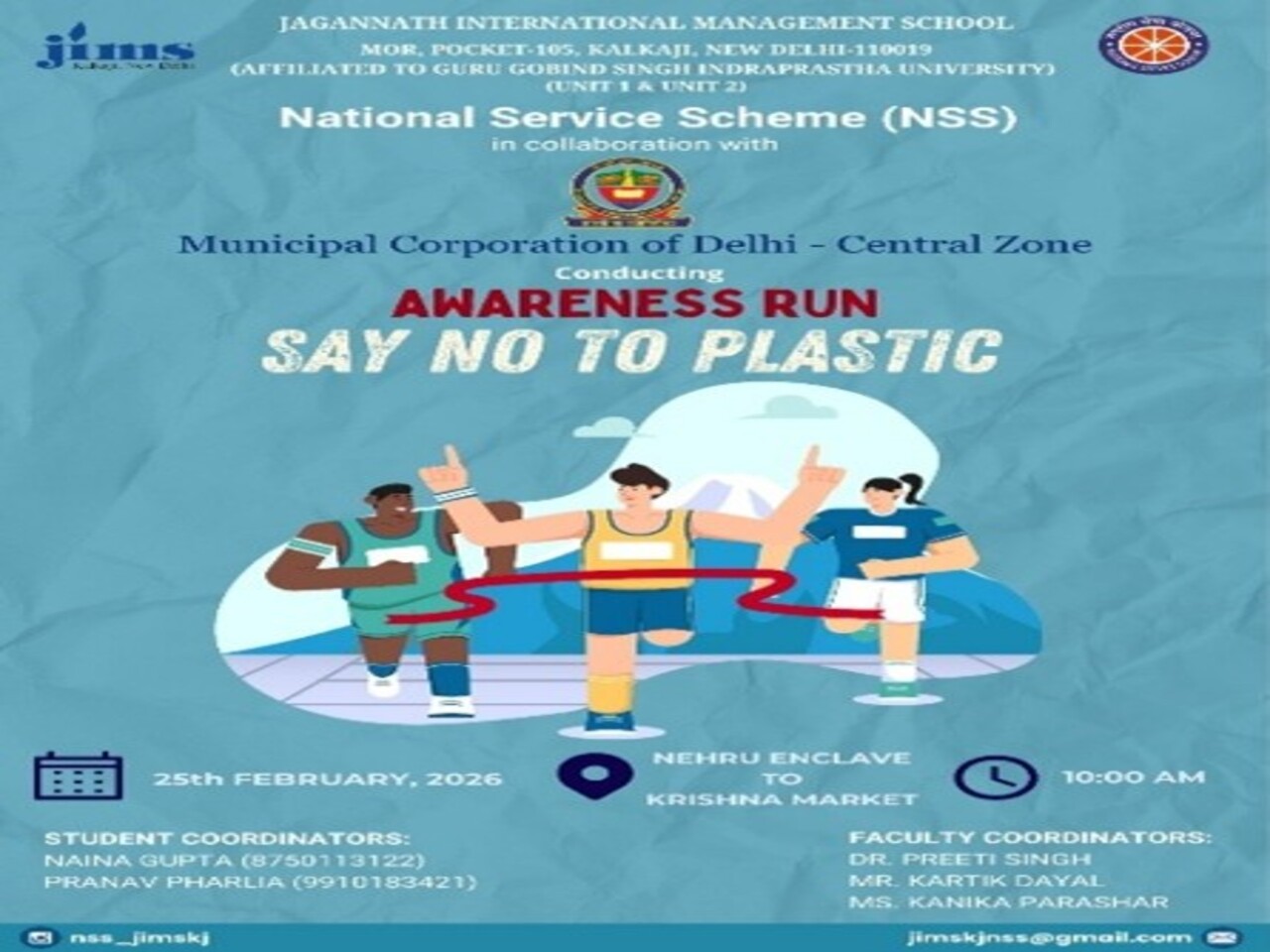 Red Run at NSUT was held on 15-09-2024. Prayaas the NSS club of JIMS Kalkaji, took part in THE RED RUN in which the event served as a platform to educate youth about correct information related to HIV/AIDS, sexually transmitted infections (STIs), and sexual health. Participants ran with red ribbons—a symbol of solidarity and commitment to combat HIV/AIDS. The run emphasized the importance of prevention, early detection, and destigmatization. Through this collective effort, DSACS reinforced the message that youth play a crucial role in curbing the spread of HIV. Student volunteer from our college also secured top 10 position and won a memento. The RED RUN was not just a physical event; it was a collective stride toward a healthier, more informed society. By engaging youth, promoting awareness, and breaking down barriers, DSACS and NACO continue to strengthen the fight against HIV/AIDS.