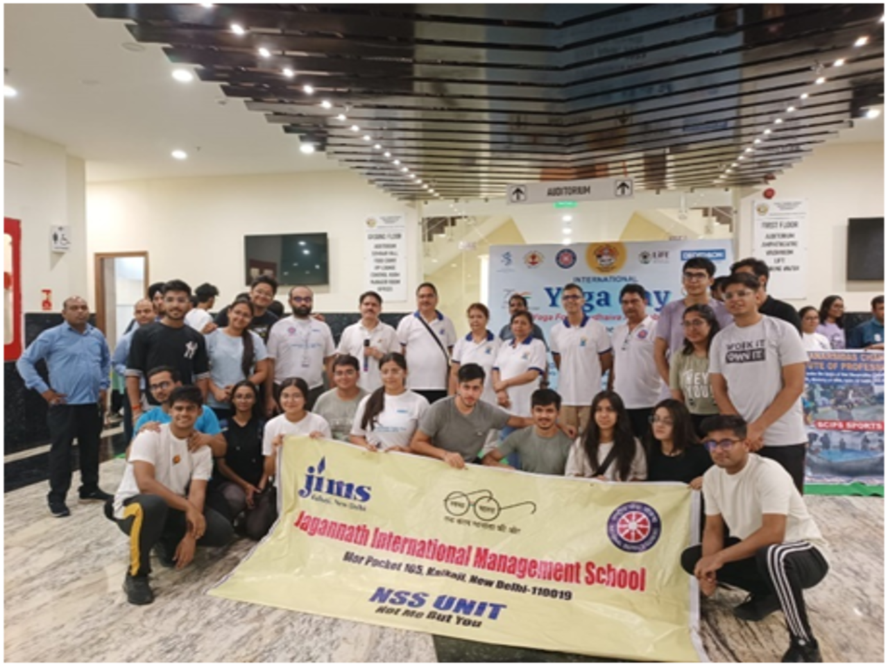 Prayaas, the NSS Club of JIMS Kalkaji, participated in the 11th International Day of Yoga Celebration at GGSIPU, Dwarka Campus on the occasion of International Yoga Day. The session commenced with a guided group yoga practice led by certified instructors, where volunteers were introduced to various asanas (postures), pranayama (breathing techniques), and meditation practices. Following the session, a short presentation was delivered to enlighten participants about the origin, history, and global significance of International Yoga Day, which is celebrated every year on 21st June as declared by the United Nations in 2014. Student volunteers later performed a series of yoga asanas as a demonstration, promoting body awareness, flexibility, and concentration. The event concluded with the distribution of specially designed Yoga Day t-shirts and refreshments to all participants as a token of appreciation for their active involvement. Volunteers gained practical knowledge of basic yoga techniques and breathing exercises and understood the cultural and global significance off yoga day. The event fostered a sense of discipline, inner balance, and community participation among volunteers and they experienced the mental and physical benefits of yoga, such as improved focus, flexibility, and stress relief.