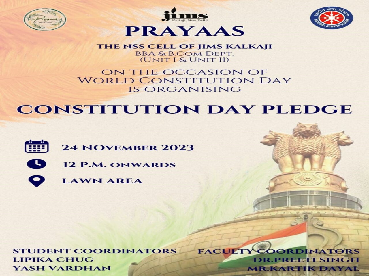 padyatra organized by NSSRD and Ministry of Youth Affairs & Sports was held on 25-11-2024.Prayaas, the NSS club of JIMS Kalkaji, participated in padyatra organized by NSSRD and Ministry of Youth Affairs & Sports to celebrate the 75th Constitution Day of India. The event started at Major Dhyan Chand Stadium and concluded at India gate, a vibrant padyatra was organized as part of the 75th celebration, with various activities held at India Gate, including stage plays, poetry readings, storytelling, and a flag relay. The event aimed to honor the spirit of the padyatra engaged in a range of activities such as dance and music performances. The core element of a padyatra was walking long distances, symbolizing the collective journey towards progress and unity. Additionally, the padyatra featured street plays and cultural performances which served as an engaging and entertaining way to spread the message of the constitution's importance. The primary objective was to celebrate the adoption of the Indian Constitution and emphasize its role in shaping-the nation’s democratic values.highlight its significance in shaping India as a democratic nation, emphasizing the values of justice, equality, and freedom.