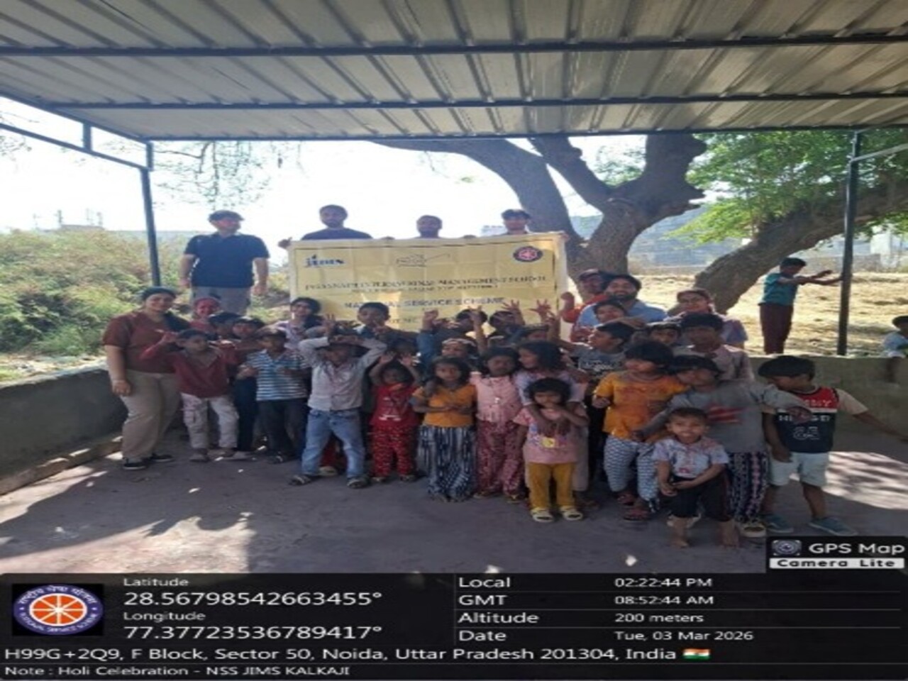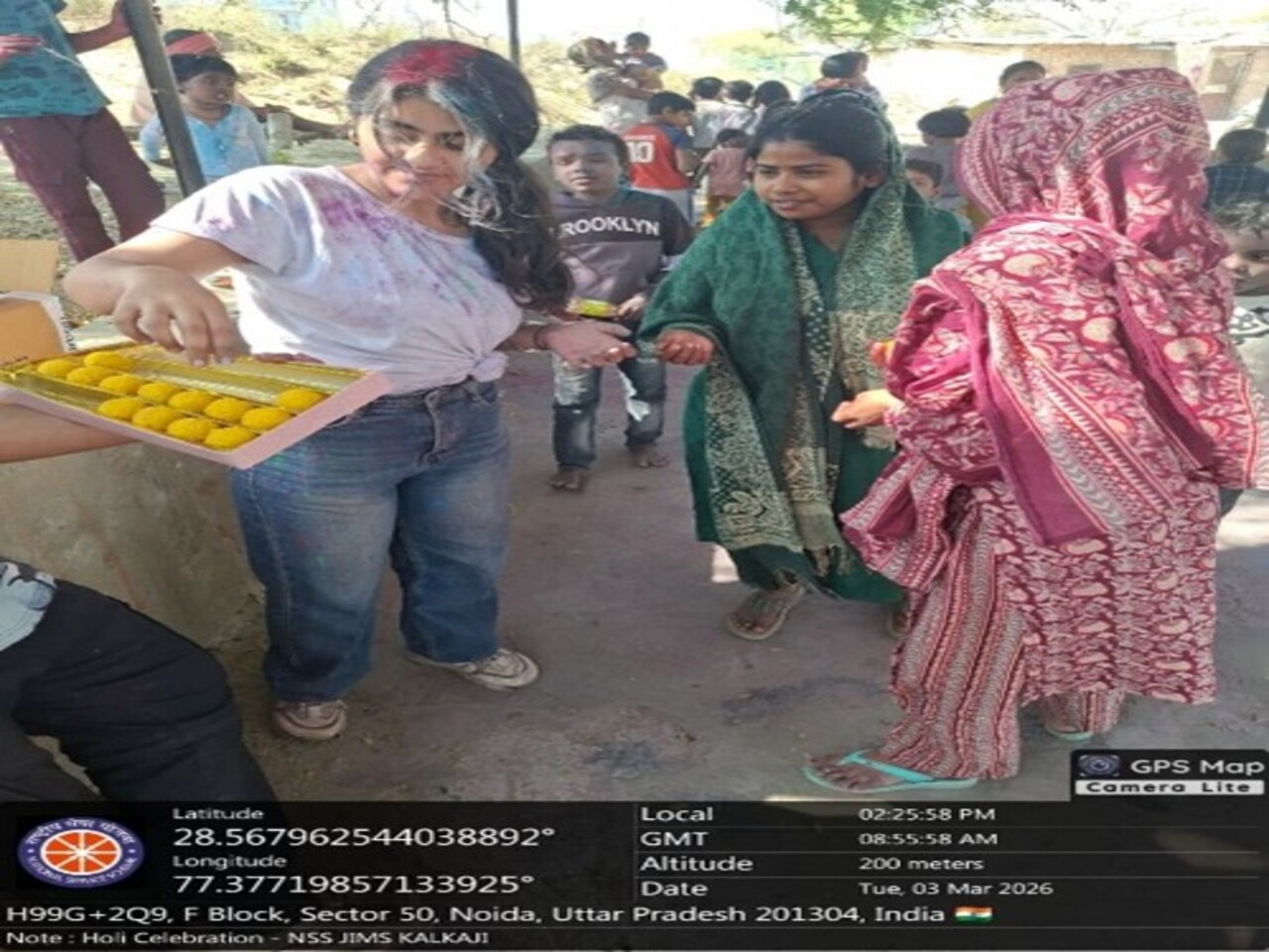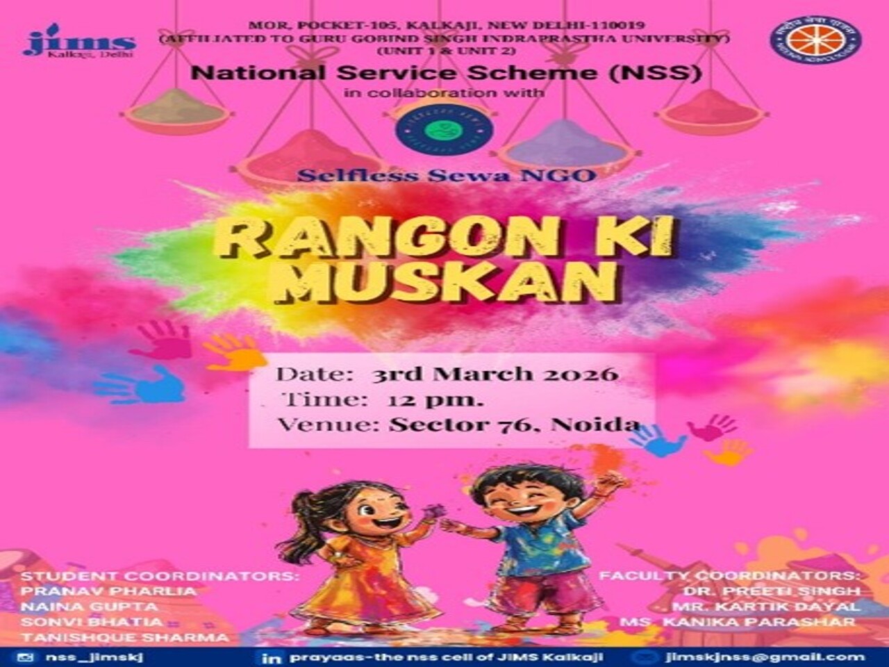 Prayaas- the NSS Club of JIMS Kalkaji, in collaboration with Selfless Sewa NGO, organized “Rangon Ki Muskan” at Sector 76, Noida on 03-03-2026. The celebration was filled with vibrant colors, laughter, and joy as volunteers engaged children in fun activities, games, and dancing to festive songs while ensuring a safe Holi celebration. Volunteers also distributed laddoos, refreshments, gulal and balloons, bringing immense happiness to the children. The smiles on their faces beautifully reflected the true spirit of the festival — unity, kindness, and togetherness. Through this initiative, volunteers created joyful and memorable moments for the children while reinforcing the values of compassion and selfless service, making the event a truly heartwarming experience for everyone involved. Volunteers experienced profound joy witnessing children's happiness during Holi festivities. They cultivated stronger empathy and responsibility towards underprivileged communities through shared celebrations.