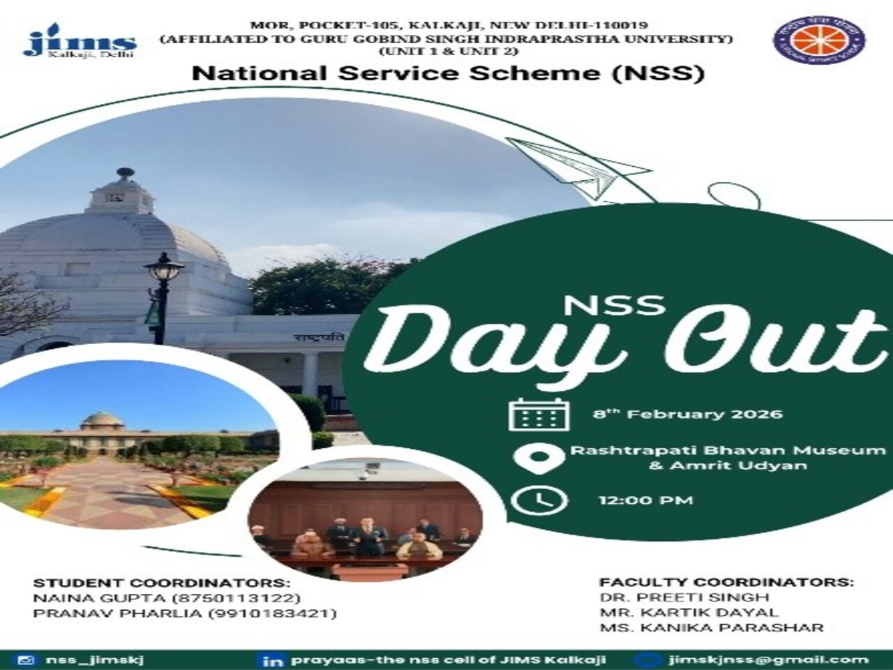 Prayaas, the NSS Club of JIMS Kalkaji, had the privilege of participating in the 79th Independence Day celebrations at the historic Red Fort. In the lead-up to the celebration, our volunteers underwent a rigorous 10-day training program under the guidance of NSSRD officials, where they were trained in event management, crowd control, protocol handling, and understanding the legacy of the Red Fort. On 15th August 2025, the volunteers actively contributed to the smooth execution of the event in coordination with the Delhi Police and the Ministry of Defence. A proud moment came when the NSS team, along with NCC cadets, formed the “Naya Bharat” logo, symbolizing unity and the vision of a progressive India. The volunteers also had the honour of witnessing the Hon’ble Prime Minister Shri Narendra Modi hoist the national flag and deliver his inspiring address, followed by a memorable interaction where the Prime Minister personally greeted the NSS volunteers, appreciating their dedication. The day’s grandeur was further elevated by a spectacular flower shower from helicopters, marking the celebrations with patriotic fervour. Volunteers gained practical experience in large-scale event management and crowd coordination and understood the importance of teamwork, discipline, and protocol adherence in national events. They experienced the honour of being recognized by the Prime Minister for their dedication and service