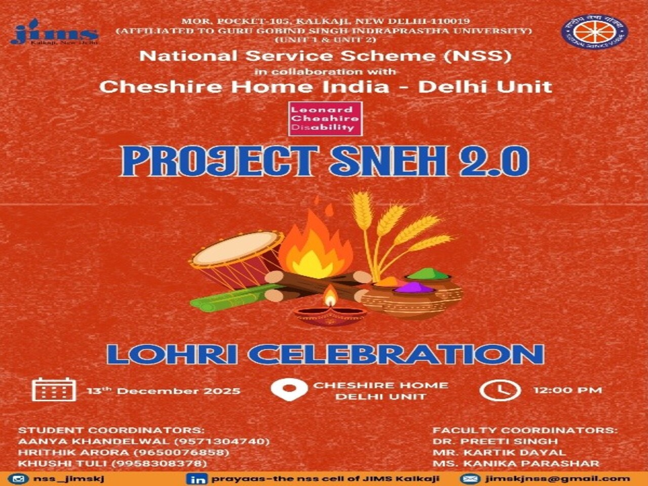 Prayaas- the NSS Club of JIMS Kalkaji, successfully organized Project Sneh 2.0 at Cheshire Home India, Delhi Unit, celebrating the festival of Lohri with the residents in a spirit of unity and joy on 13.01.26. The volunteers spent quality time with the residents through interactive activities, music, and dance, creating a warm and lively atmosphere despite the absence of a traditional bonfire. Lunch boxes along with Lohri delicacies such as popcorn, muffins, peanuts, and rewari were distributed to the residents, symbolizing care, generosity, and cultural respect. In addition, the festival was also celebrated within the college premises by distributing gifts to the college support staff as a gesture of gratitude and appreciation. The event was graced by the presence of Dr. Preeti Singh and Mr. Kartik Dayal, NSS Programme Officers, whose guidance and support strengthened the initiative and reflected JIMS Kalkaji’s commitment towards social service and community engagement. Volunteers develop enhanced awareness of inclusivity, empathy, and diversity's richness via participatory festive observances. Participants acquire hands-on proficiency in event orchestration, community immersion, and the transformative power of joy-infused interactions for differently abled individuals.