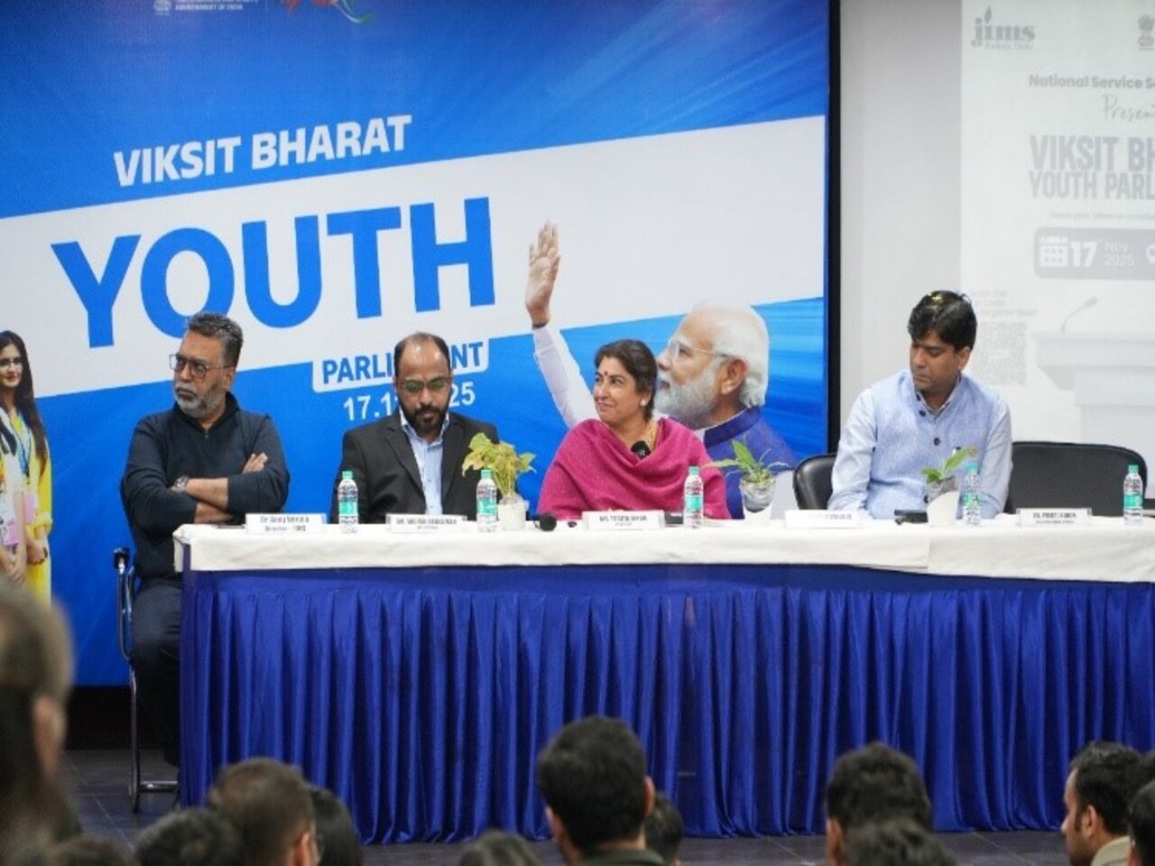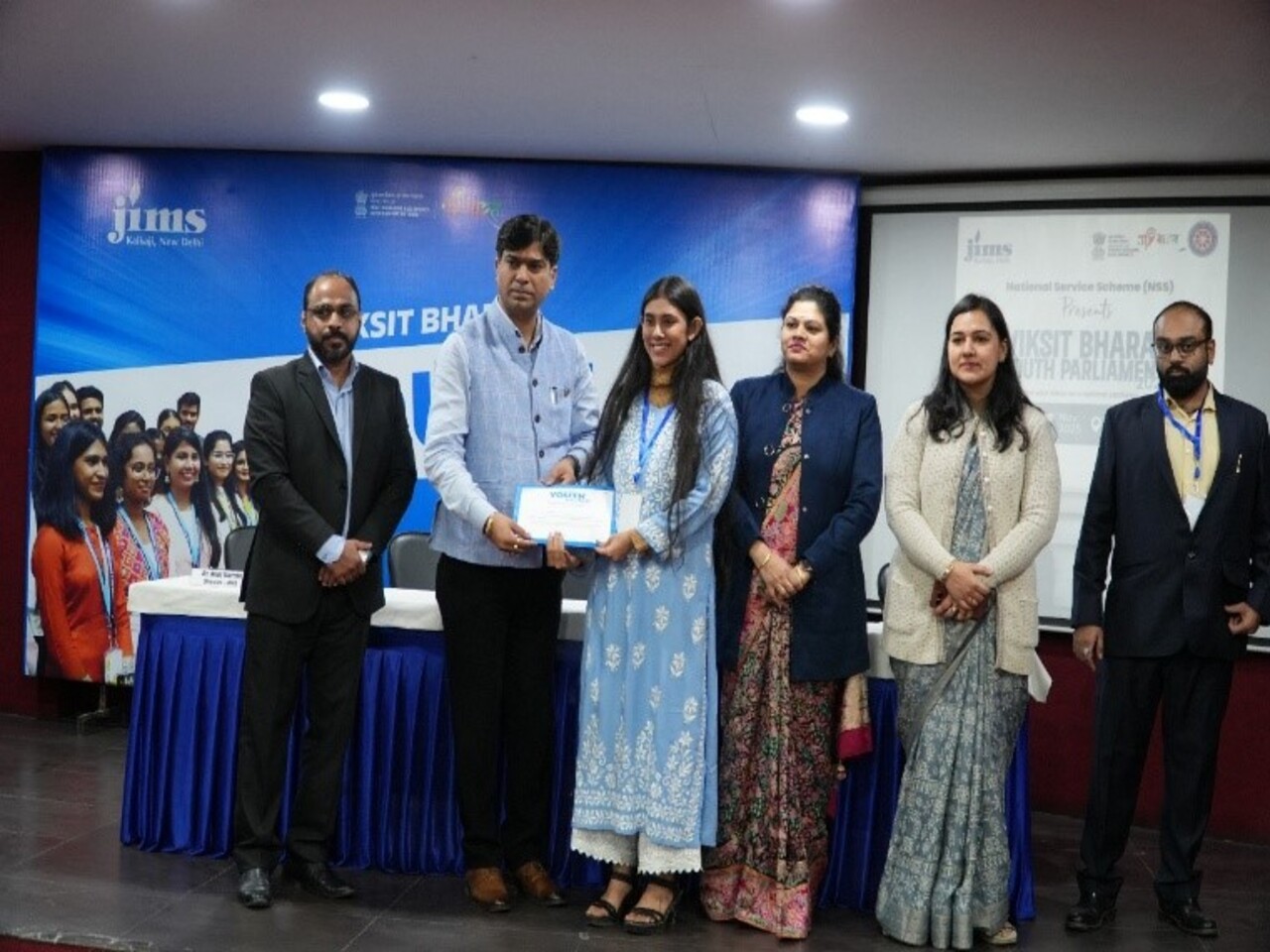 Prayaas- the NSS Club of JIMS Kalkaji, serving as the district nodal centre for the South-East District of Delhi, successfully organised the Viksit Bharat Youth Parliament 2026 on 17 November 2025 at the JIMS Kalkaji campus. The event witnessed enthusiastic participation from students across South-East Delhi, with a dedicated registration desk facilitating smooth on-spot registration and coordination. The programme began with a formal inauguration, including a traditional lamp-lighting ceremony conducted by Dr Anuj Verma, Ms Yogita Singh, Dr Sarish Sebastian, and Mr Mayank Dwivedi, setting a dignified tone for the proceedings. Ms Yogita Singh from the Bharatiya Janata Party (BJP) graced the event as the Chief Guest, while Dr Sarish Sebastian and Mr Mayank Dwivedi served as jury members and evaluated participants on content, articulation, constitutional understanding, and parliamentary decorum. The core Youth Parliament session was conducted in accordance with standard parliamentary procedures, during which participants presented their views one by one on the theme “50 Years of Emergency: Lessons for Indian Democracy,” engaging in disciplined, thoughtful, and issue-based deliberations. The programme concluded with a valedictory session in which certificates of participation were distributed to all participants, followed by refreshments for the guests and students, marking the successful culmination of an event that promoted democratic awareness, leadership, and active youth participation in nation-building. Participants gained a deeper understanding of parliamentary procedures, democratic values, and constitutional principles.