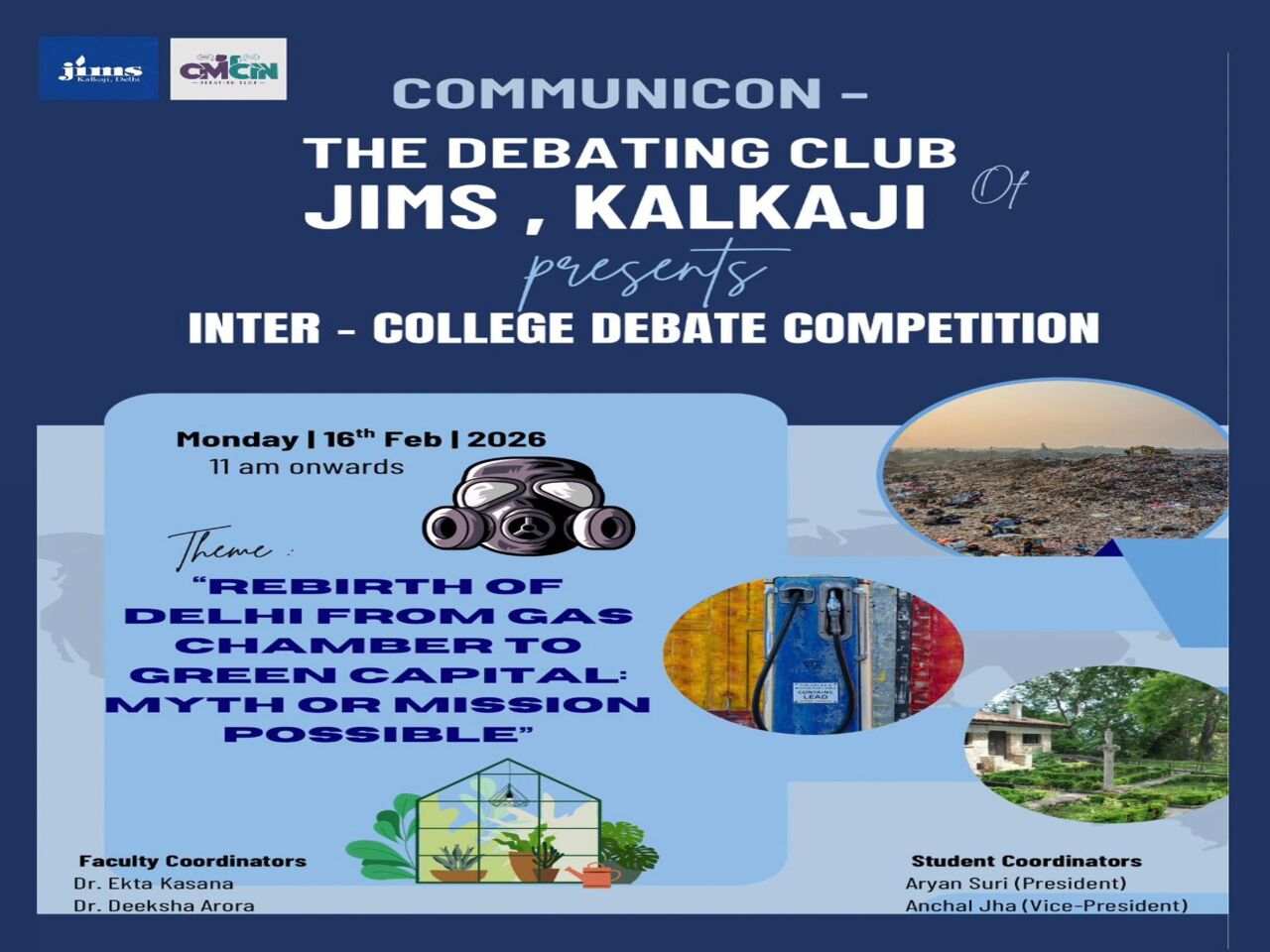 The Inter-College Debate Competition 2026 was organized by Communicon: The Debate Club at JIMS Kalkaji on 16th February 2026 at 11:00 AM in the college auditorium. The theme, “Rebirth of Delhi: From Gas Chamber to Green Capital – Myth or Mission Possible”, encouraged students to present analytical and data-driven arguments on environmental sustainability. The event was conducted under the guidance of Dr. Prashant kumar, Dr. Ruchi Srivastava, and Dr. Ekta Kasana, with support from student coordinators Aryan Suri.